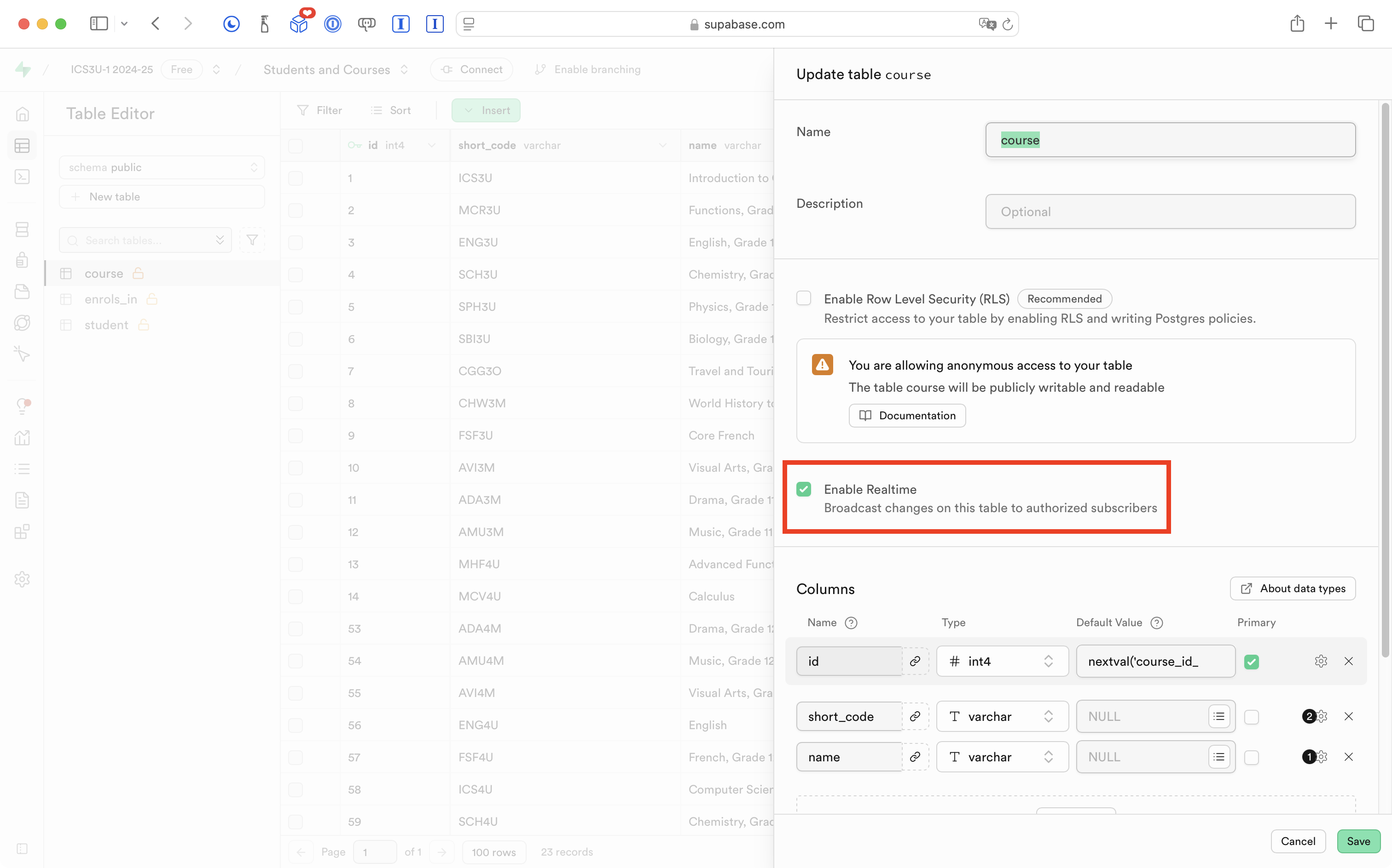 To start, we need to turn on realtime updates in the database. This makes the database a publisher.