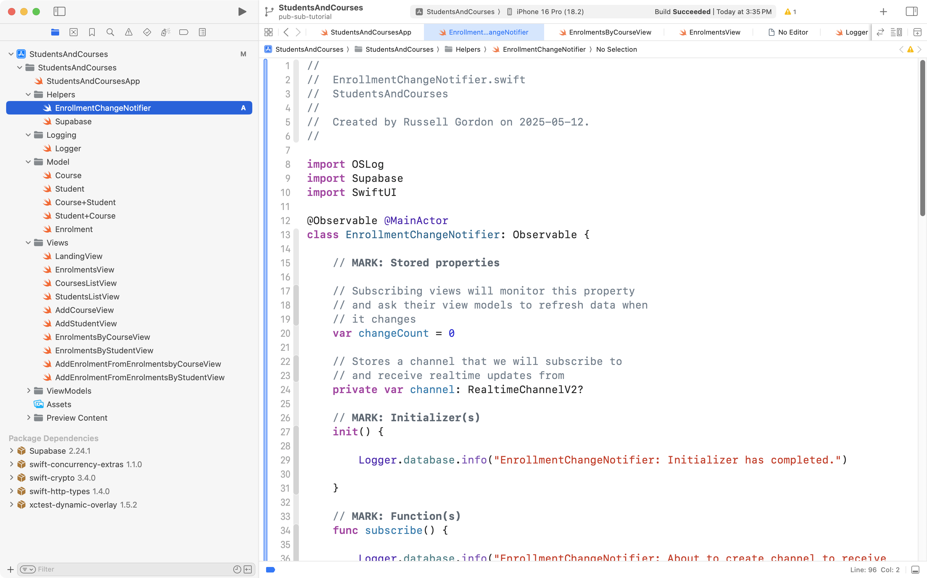 We will add an observable class to our app named EnrollmentChangeNotifier. It will use the Supabase framework to subscribe to a realtime channel, and will therefore be notified whenever the database is updated.