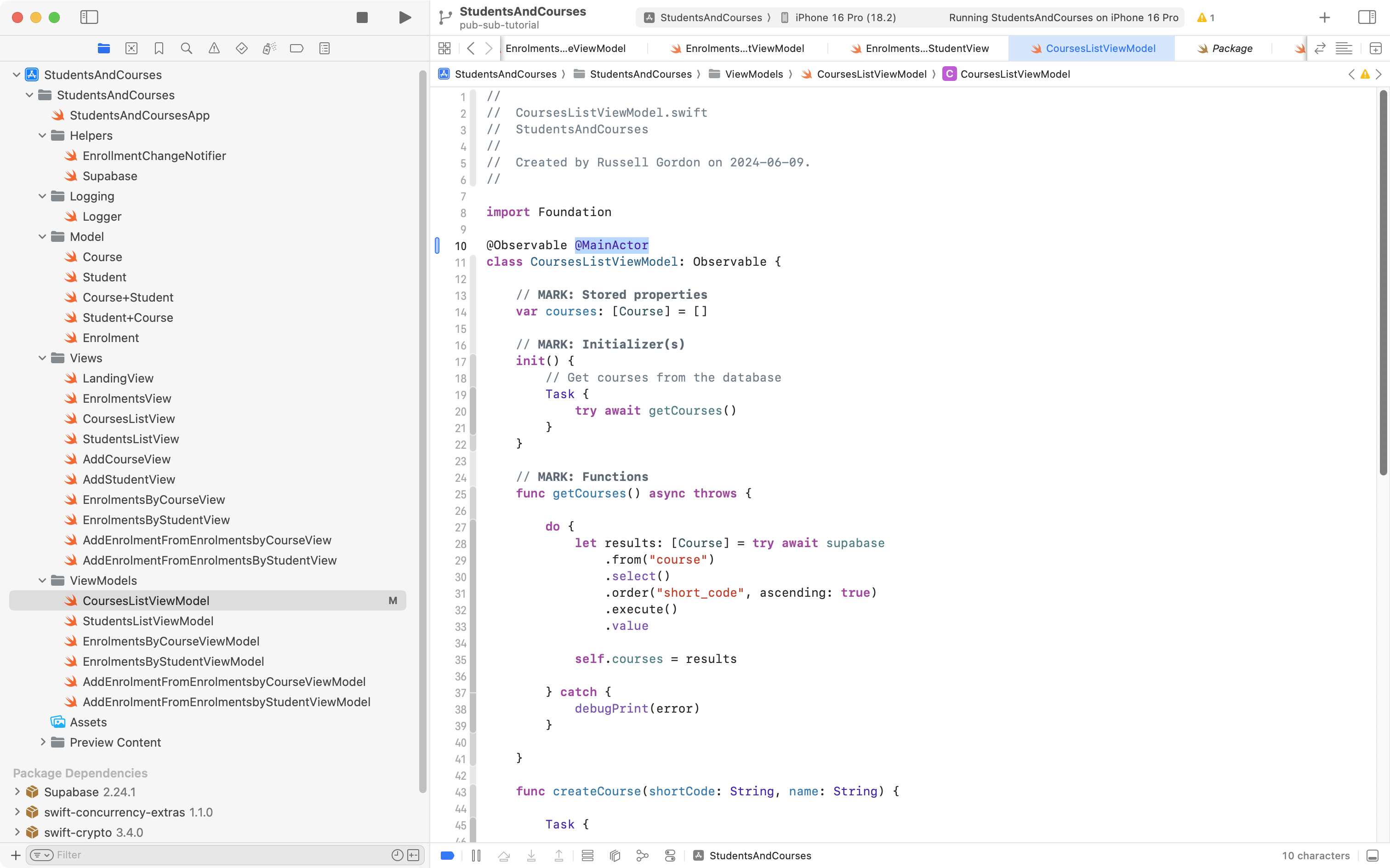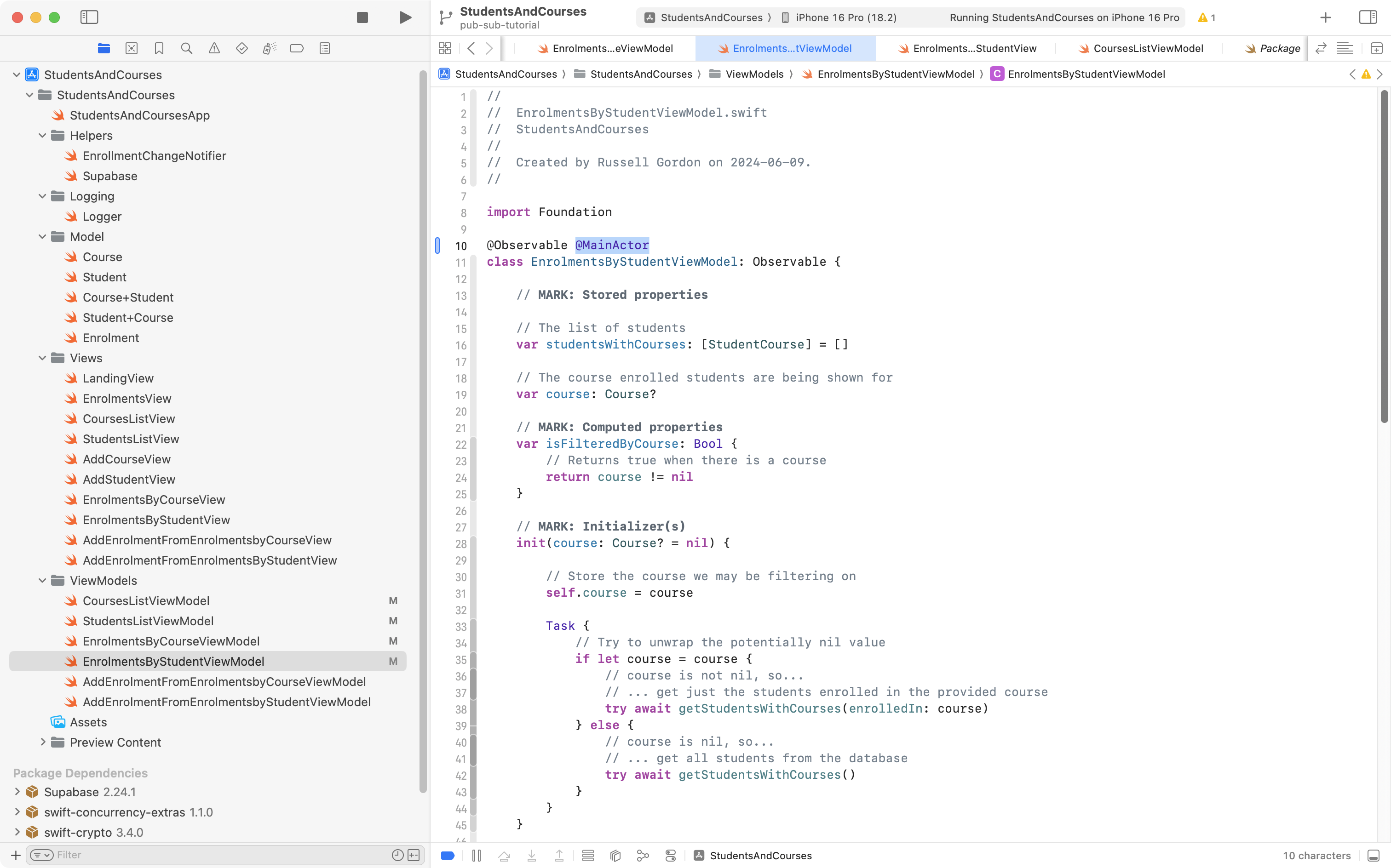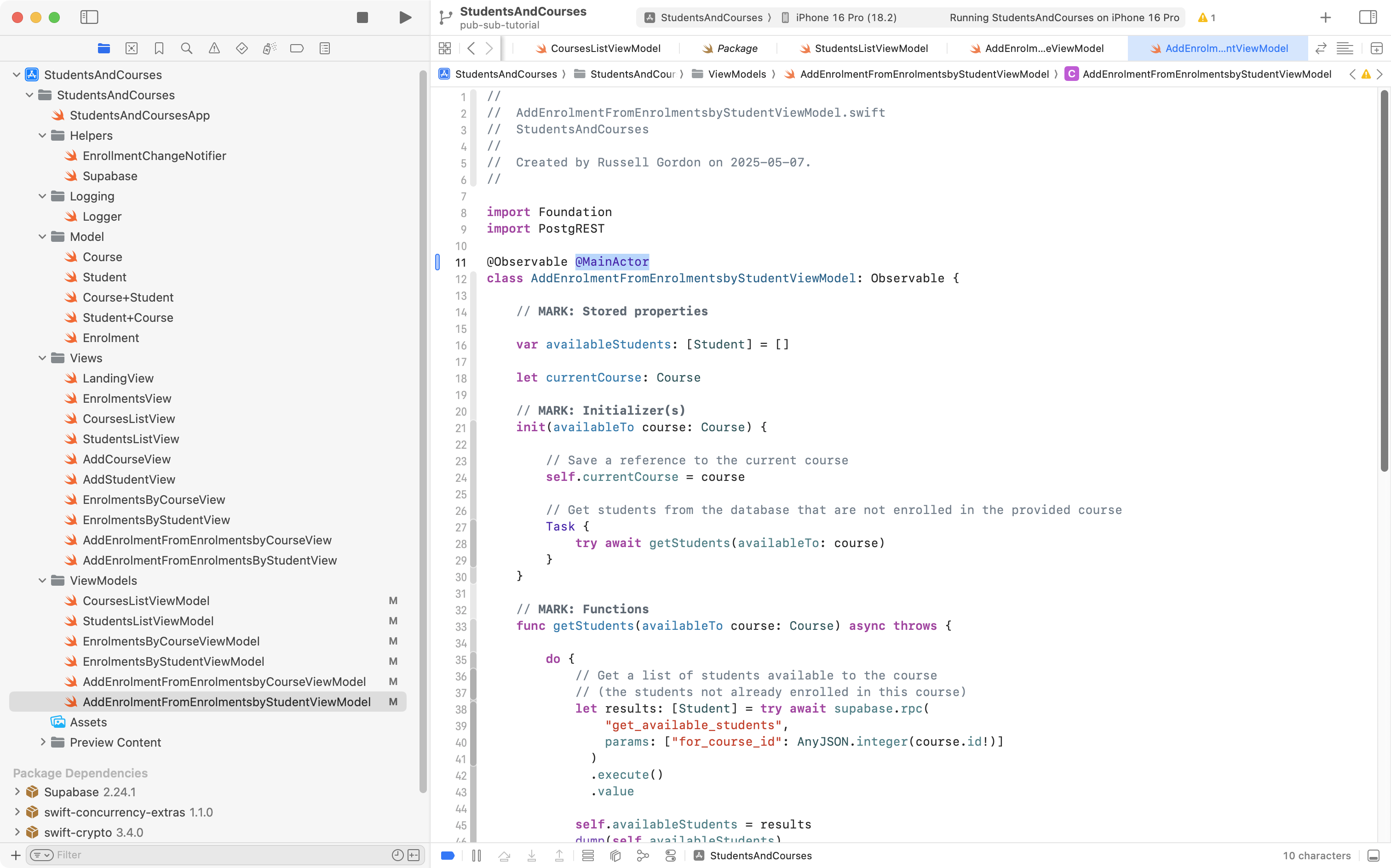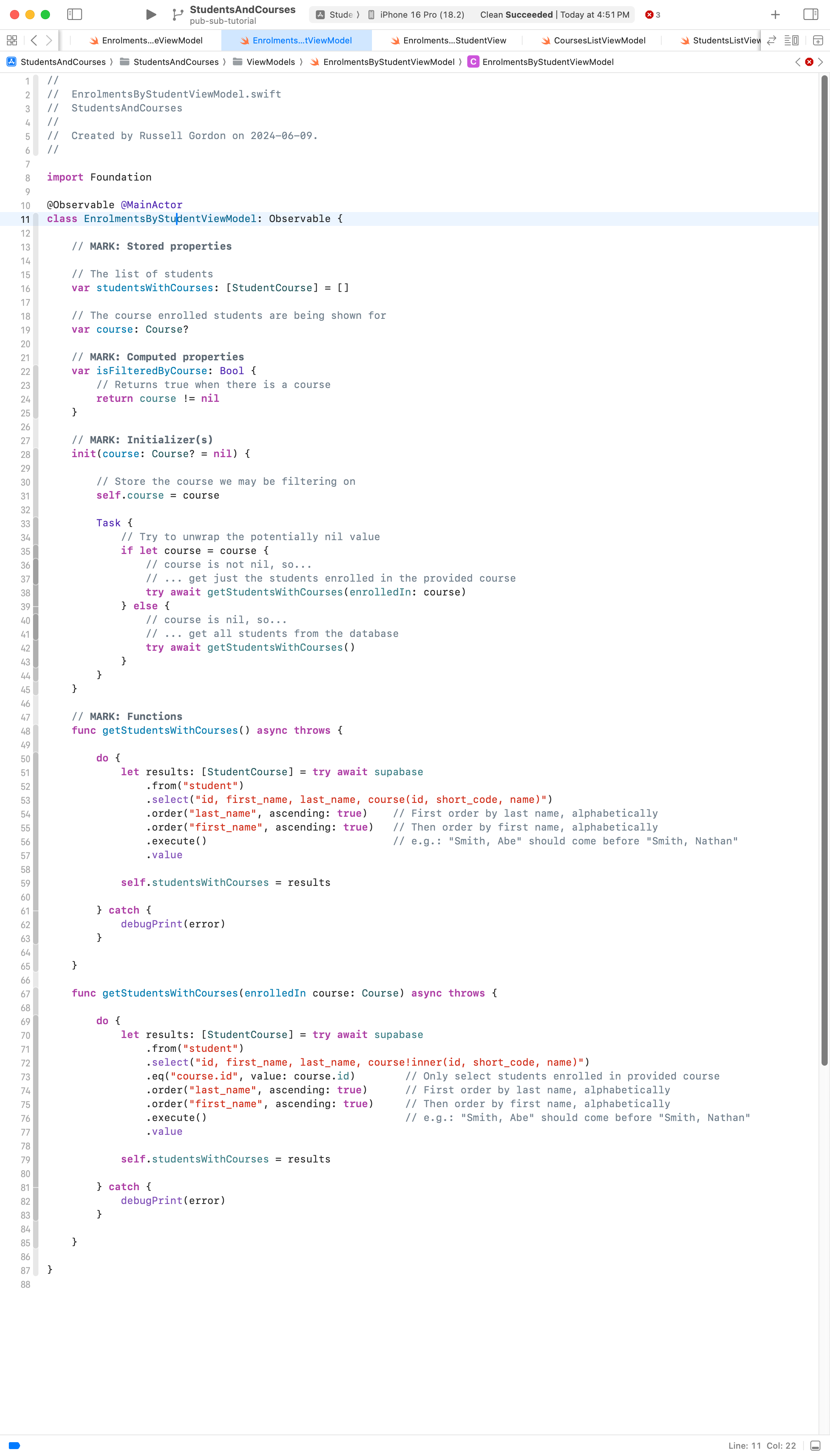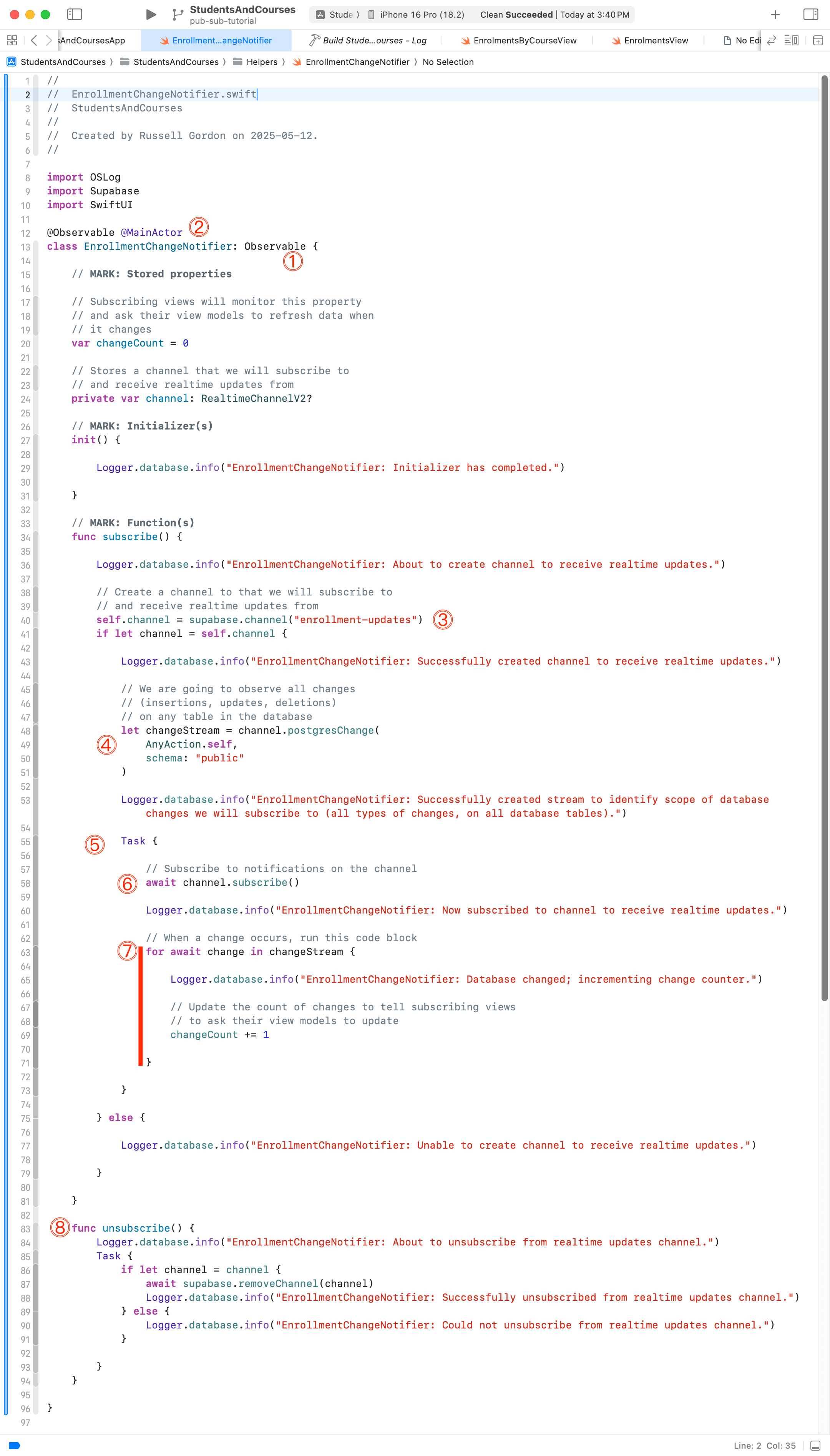 EnrollmentChangeNotifierclass must conform to theObservableprotocol, so that our views can watch the class for changes and respond accordingly.@MainActorshould be added to all classes that will drive changes to the user interface. This ensures that the code in the class will run on the main thread of our application, rather than a background thread. By running on the main thread, we ensure that the user interface updates in a timely manner. Read this for more background on what threads are, if desired.- Here we create a channel to subscribe to. Select a name that makes sense for the context of your app; here, Mr. Gordon chooses