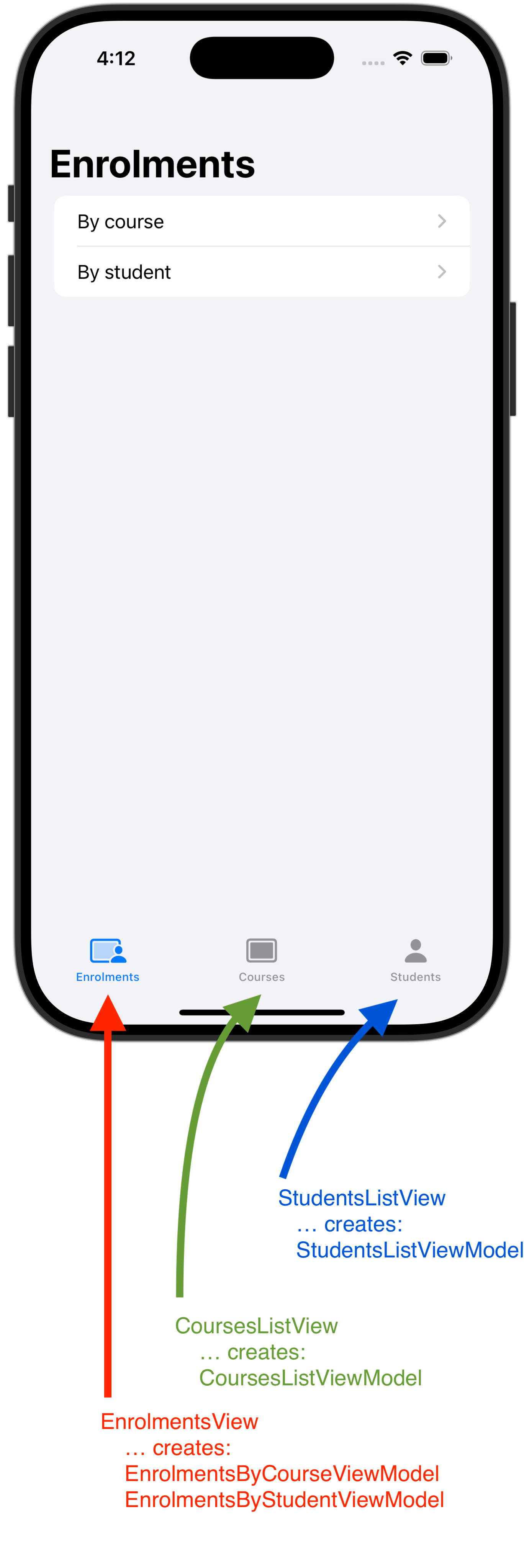 However, EnrolmentsView and the two view models it creates were made before the user added the courses on CoursesListView . Consequently, those two view models are left with out-of-date information. They have no way of knowing that the database has been changed.