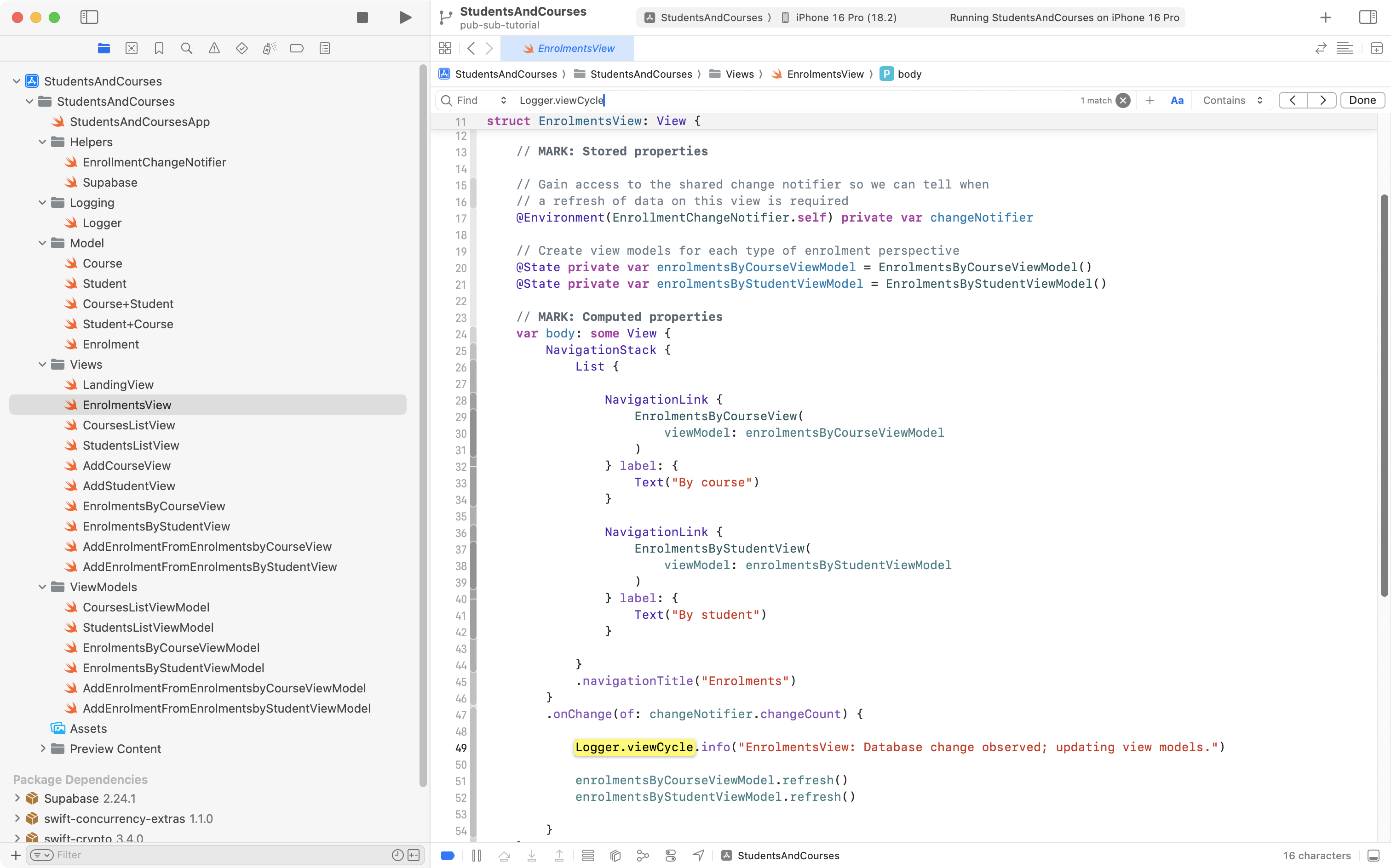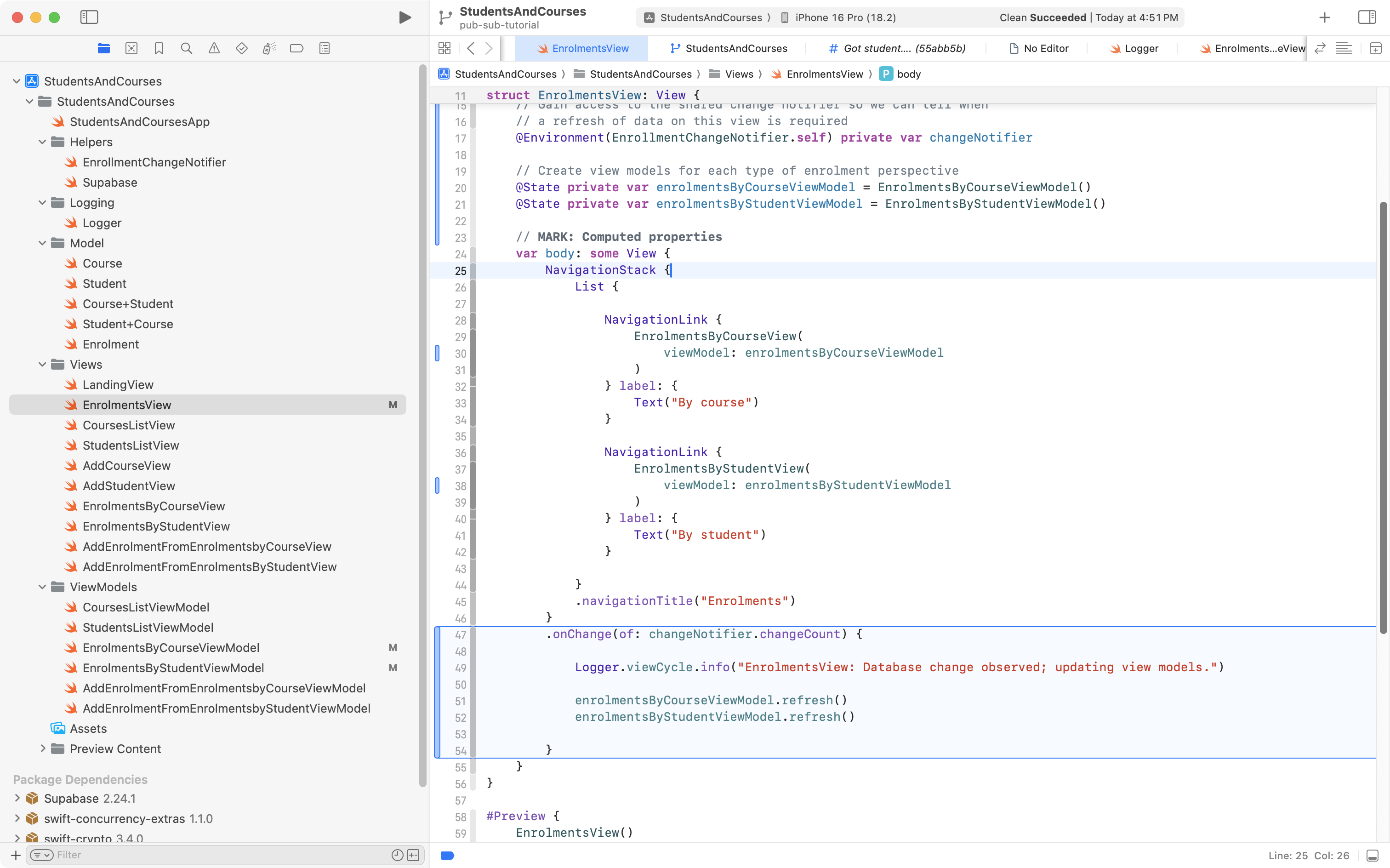 Finally, we make EnrolmentsView observe the change notifier and update its view models when a database change occurs: