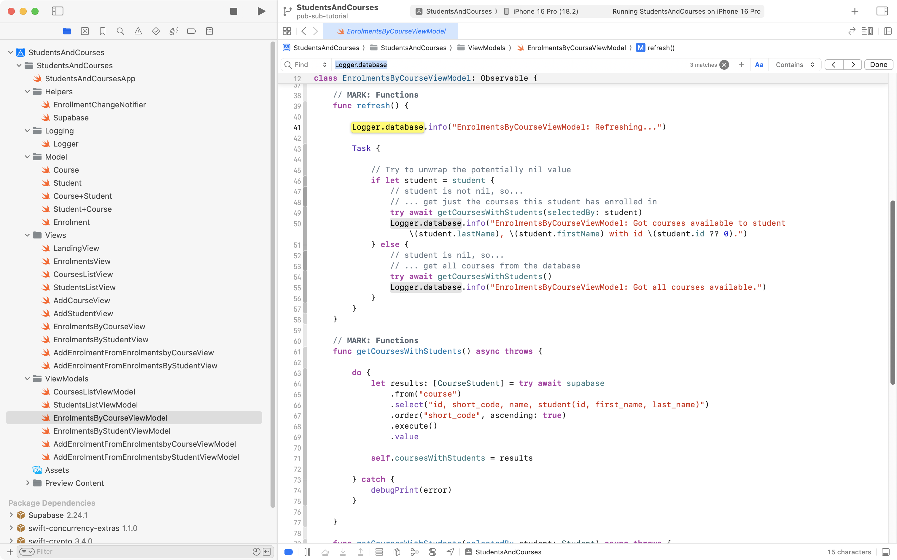 So in the video above, the user goes to CoursesListView and adds a couple of courses. CoursesListViewModel handles sending the new courses to the database. CoursesListViewModel (since it knows a new course was just added) asks the database for a refreshed list of courses.