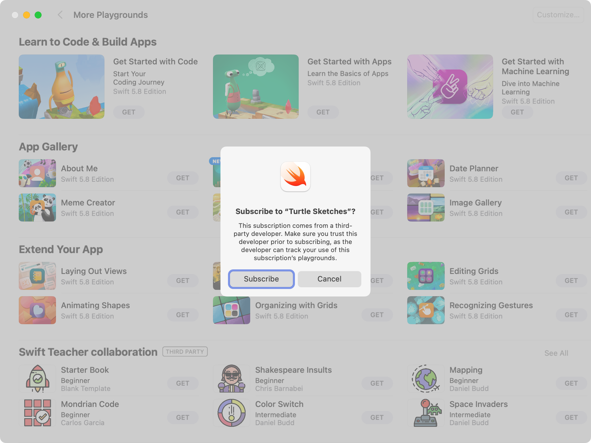 After installing the Playgrounds app on your Mac, please use the Safari web browser to follow this link and subscribe to the Turtle Sketches playgrounds authored by Mr. Gordon.