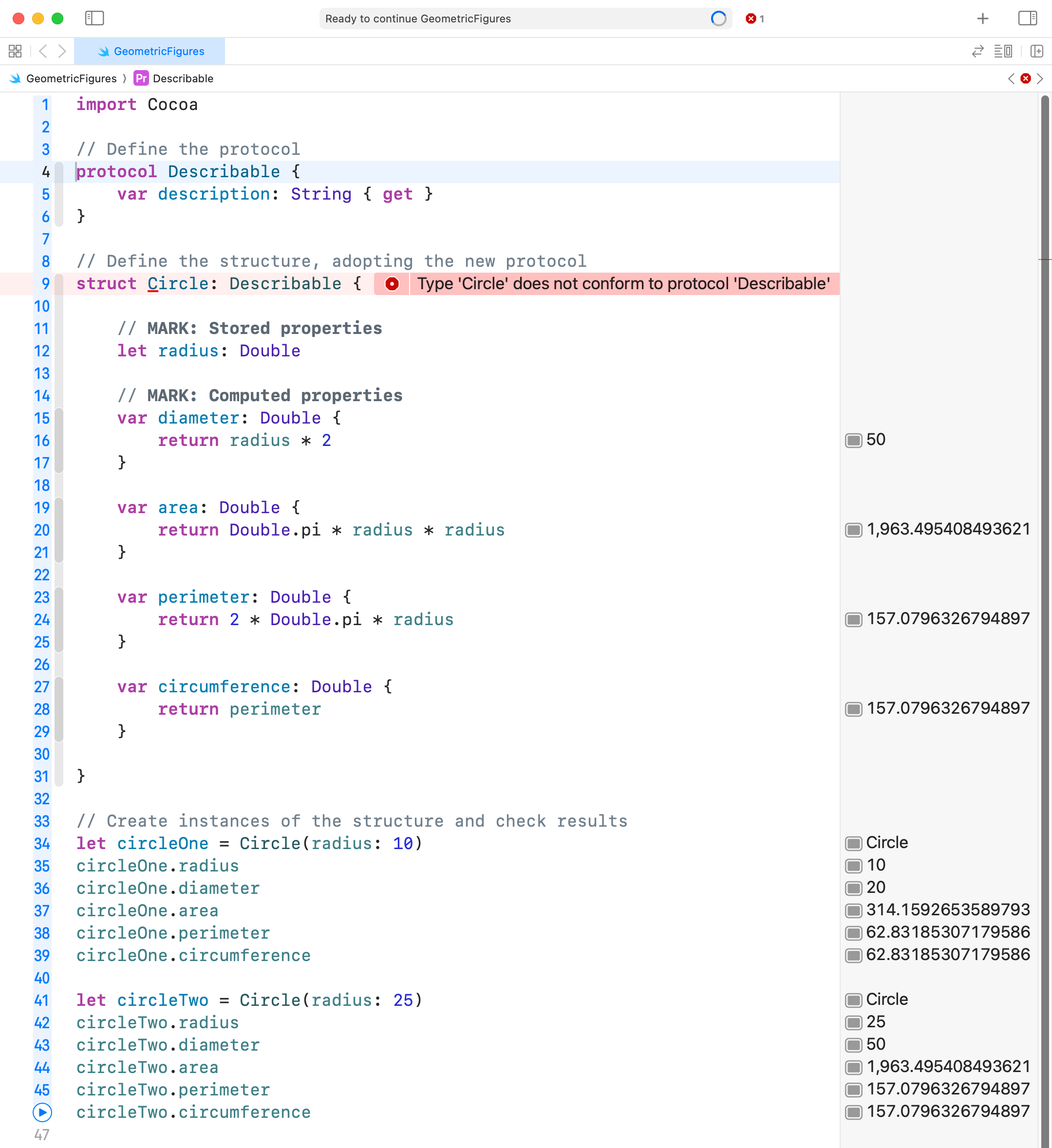 The Swift compiler throws an error, because currently, the Circle structure is not following the rules of the Describable protocol – it does not currently provide a property named description.