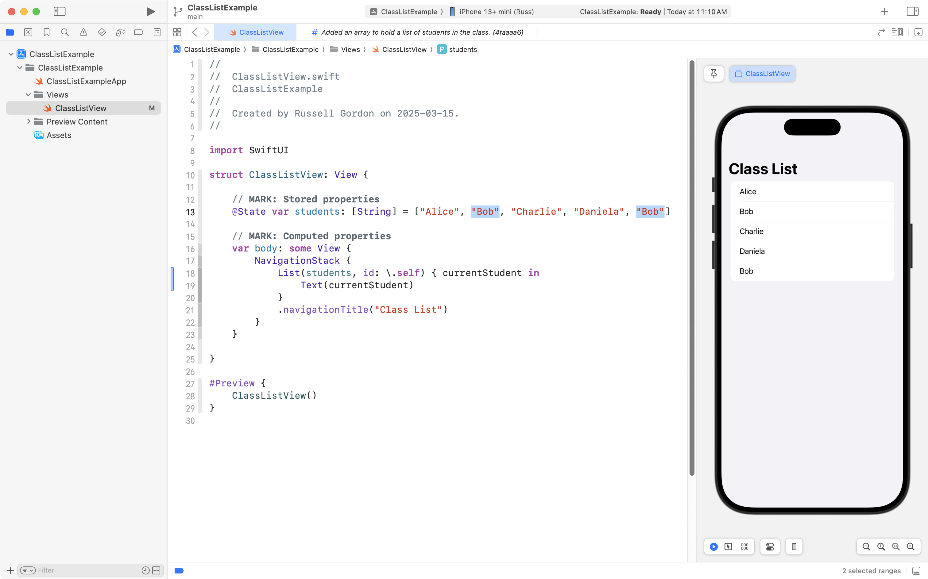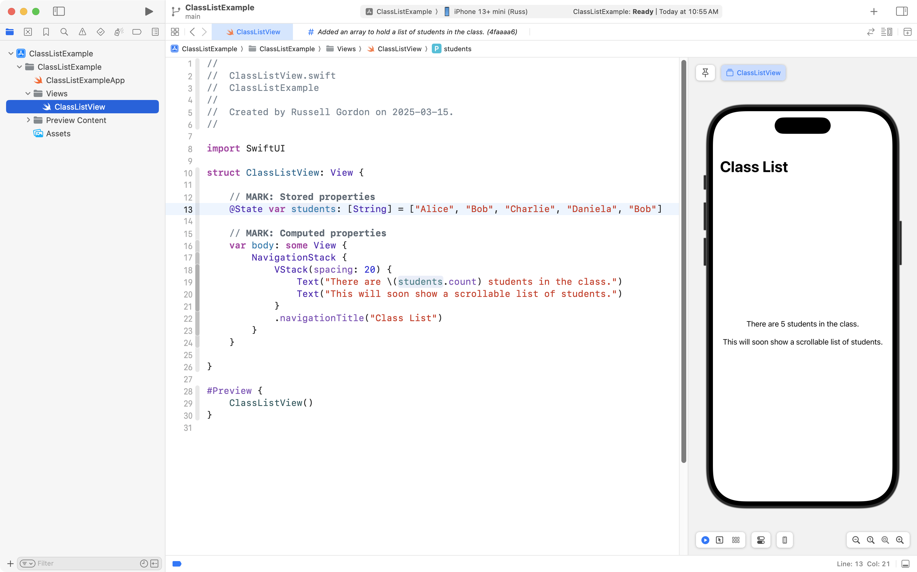 The code is very simple so far – an array named students is created on line 13, and it holds five instances of the basic String data type.