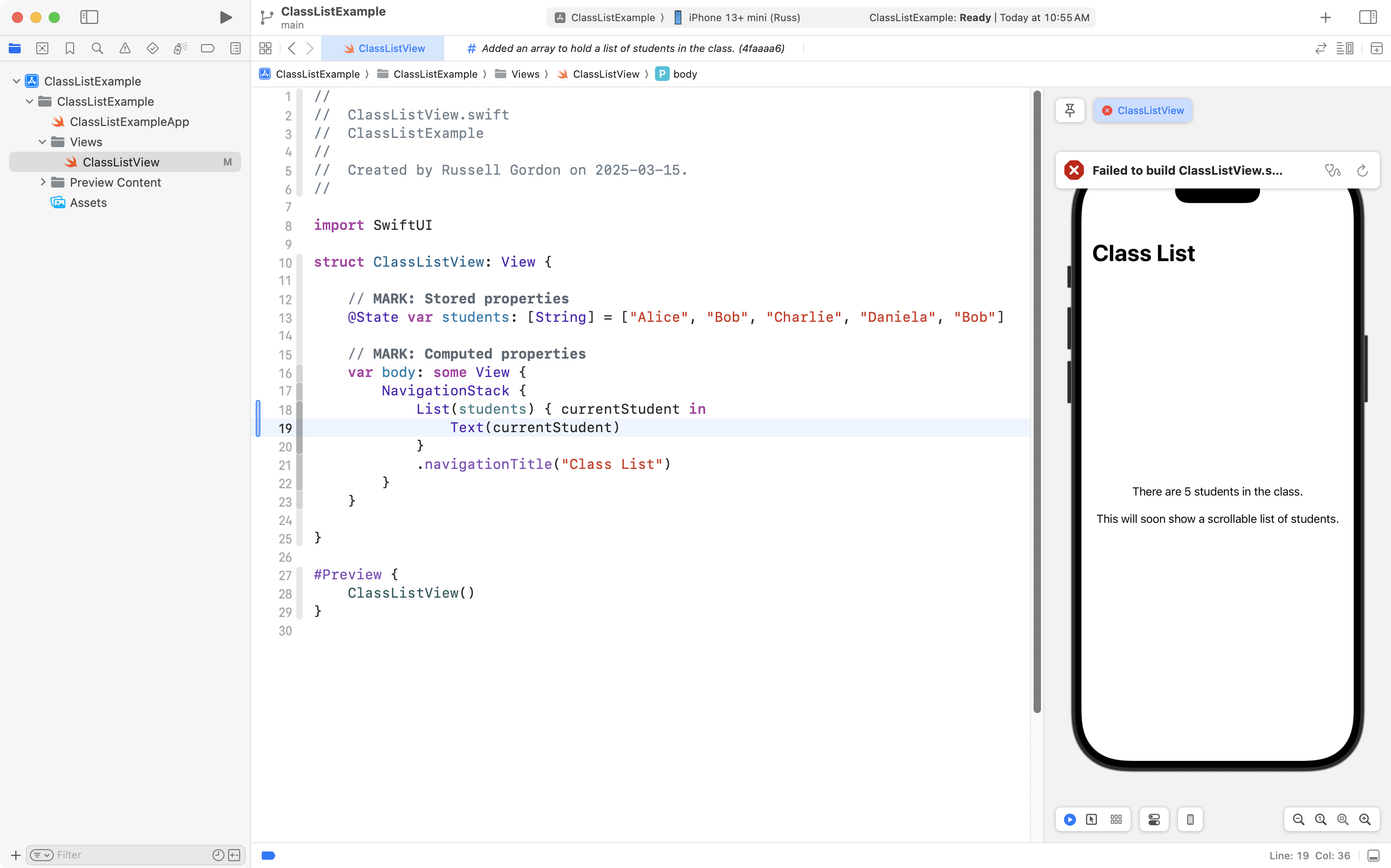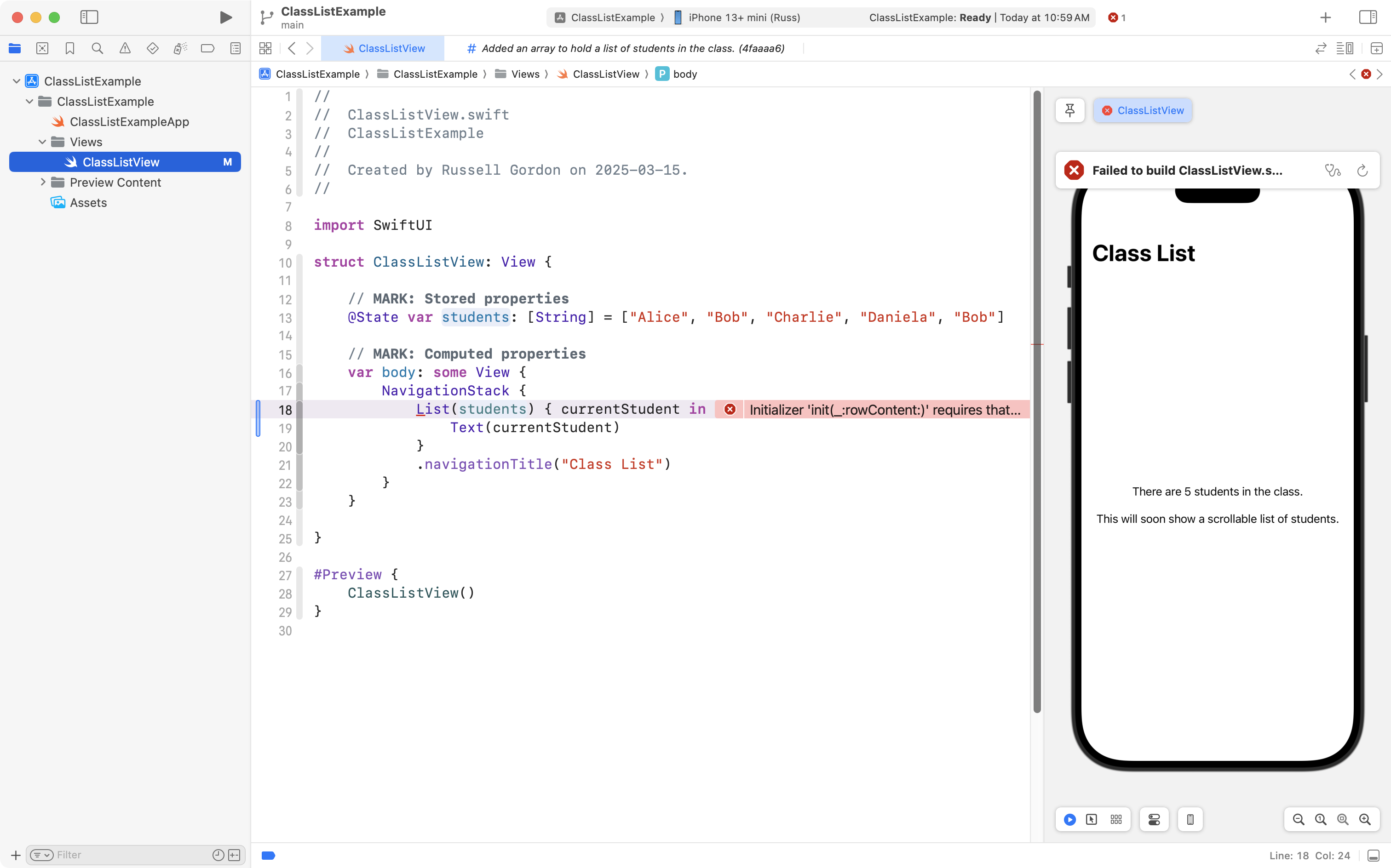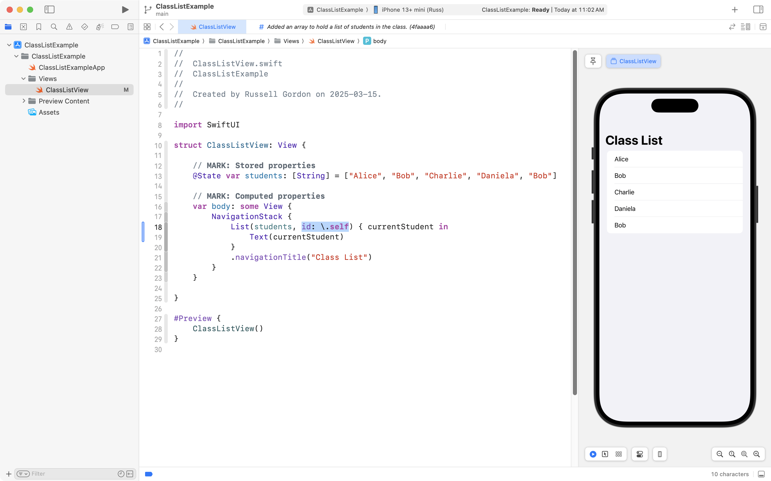 From lines 18 to 20, they use the List structure provided with the SwiftUI framework, and they hope to iterate (loop) over the elements of the array to display the five students in the class.