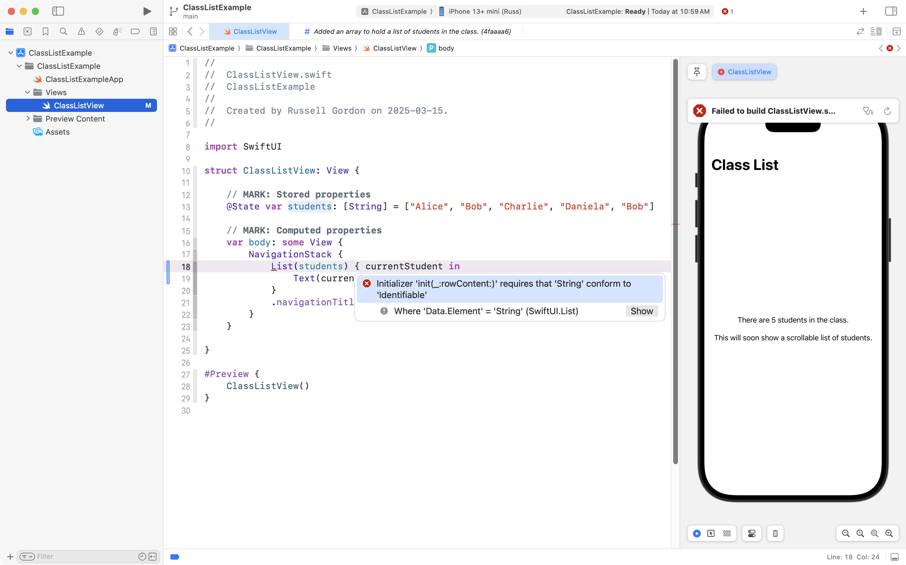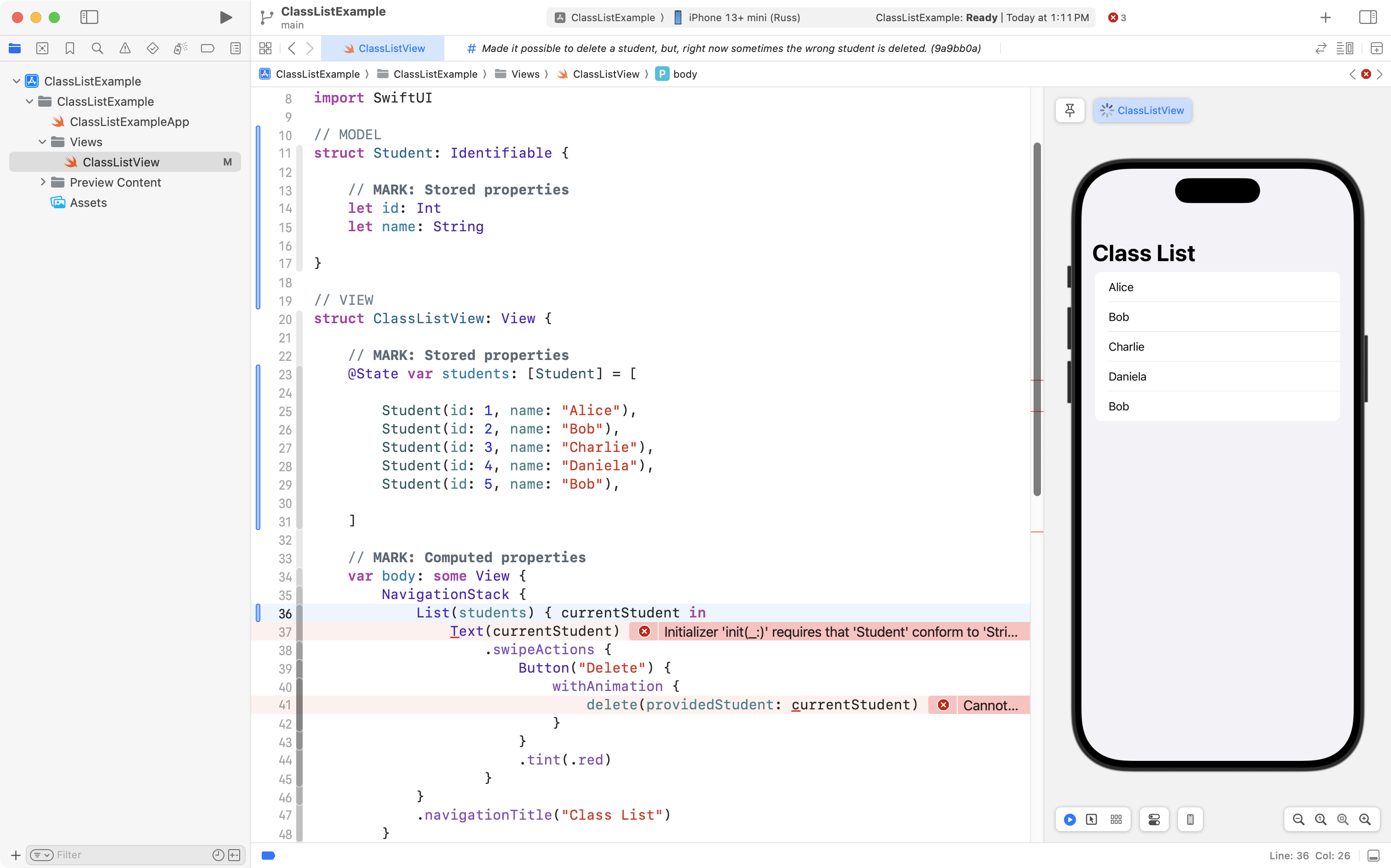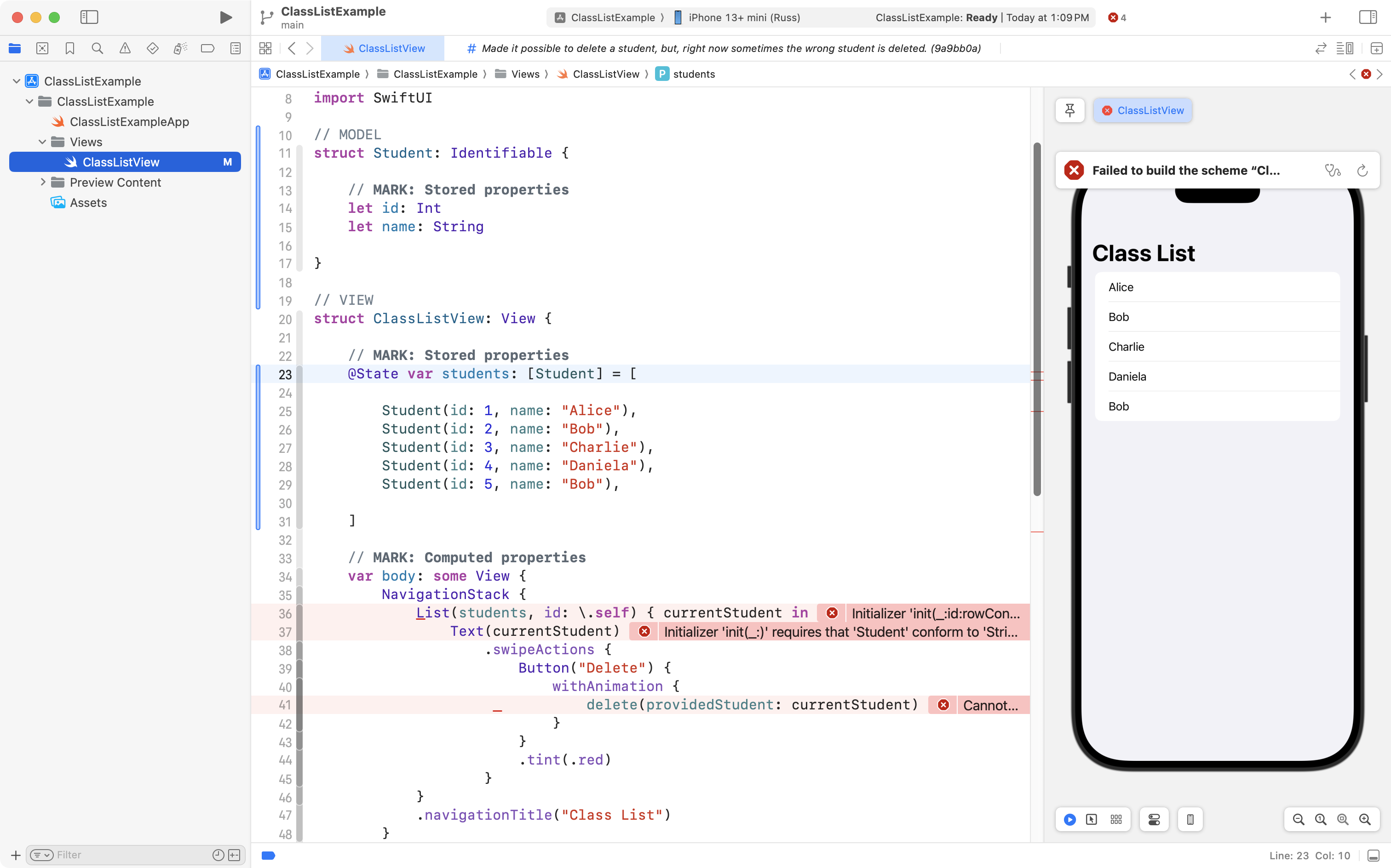 As shown on line 36 below, they can first remove the id: \.self code that was suggested by the large language model chatbot. This can be down without creating any new compiler errors because the developer just made the Student data type conform to the Identifiable protocol: