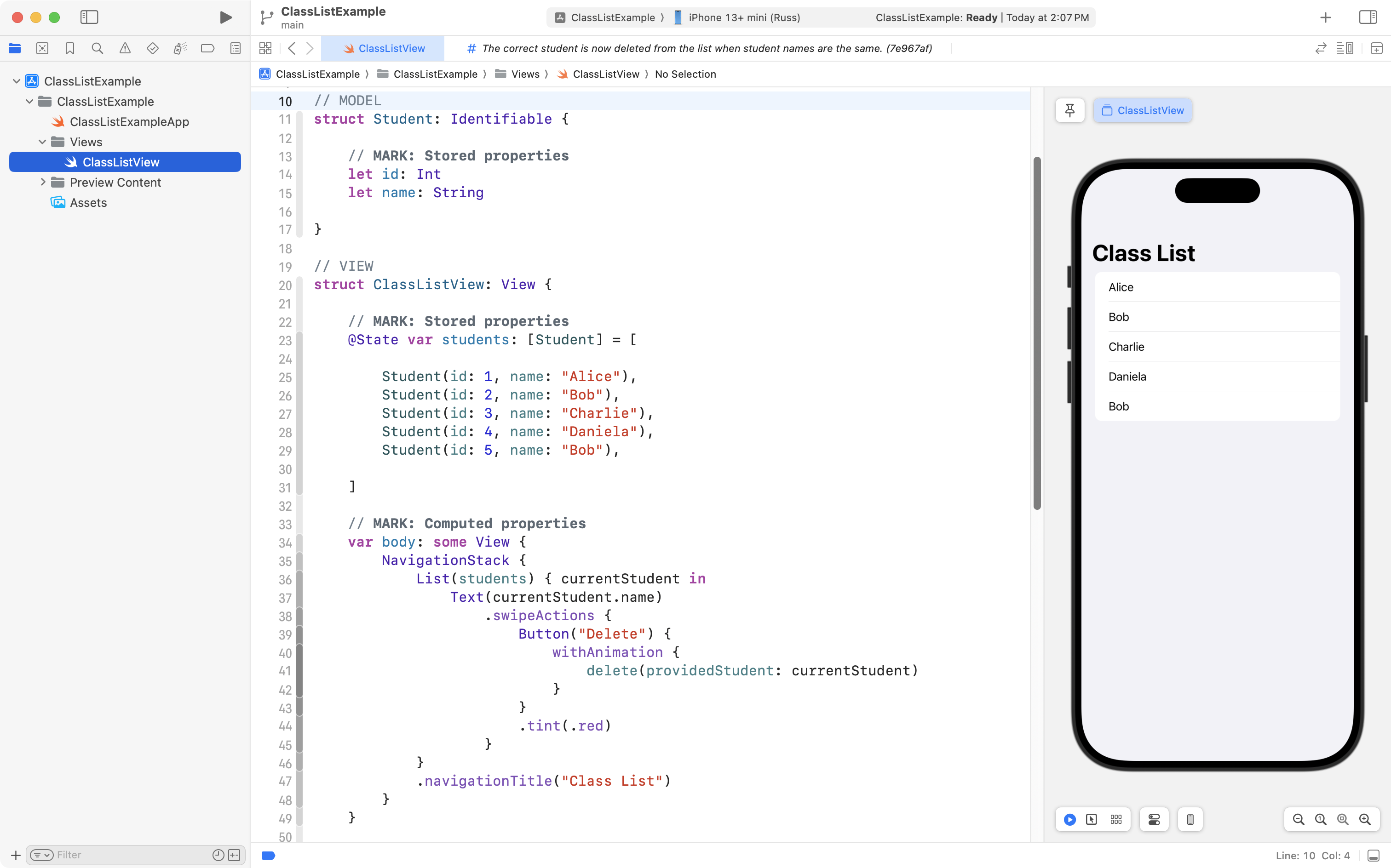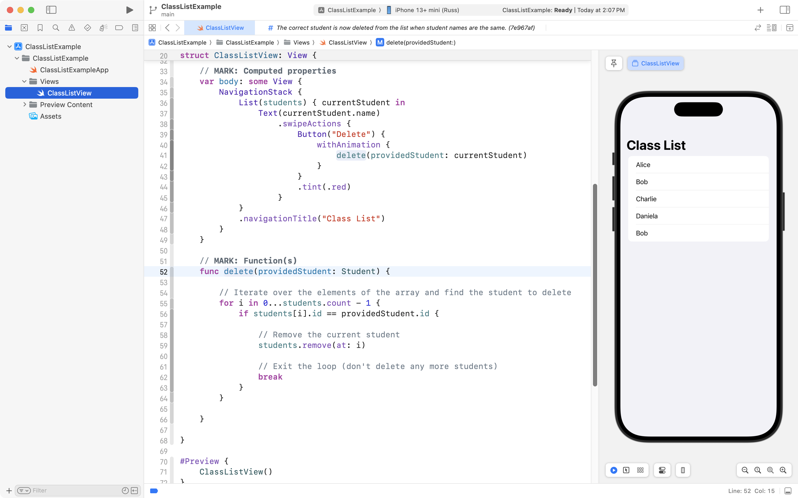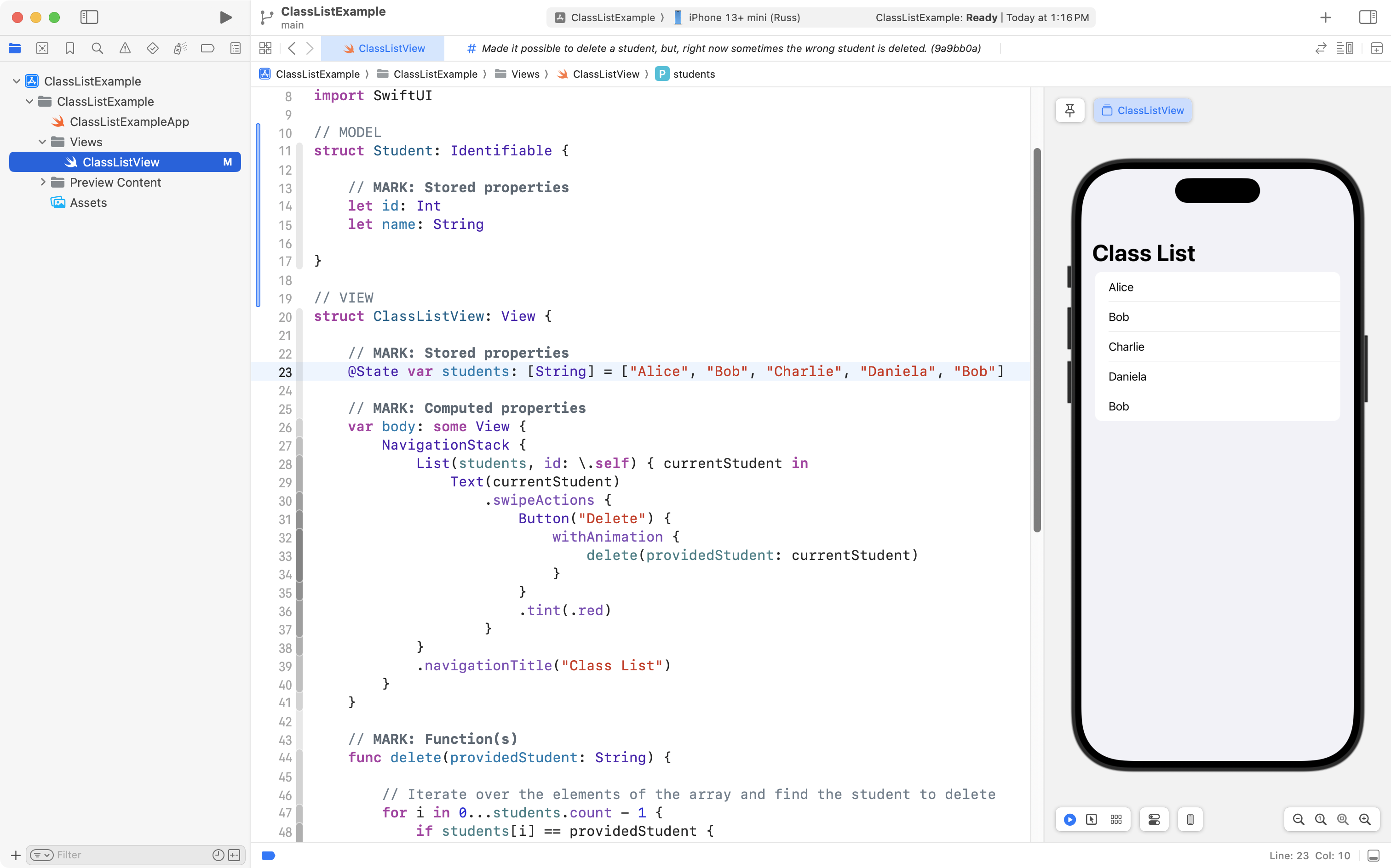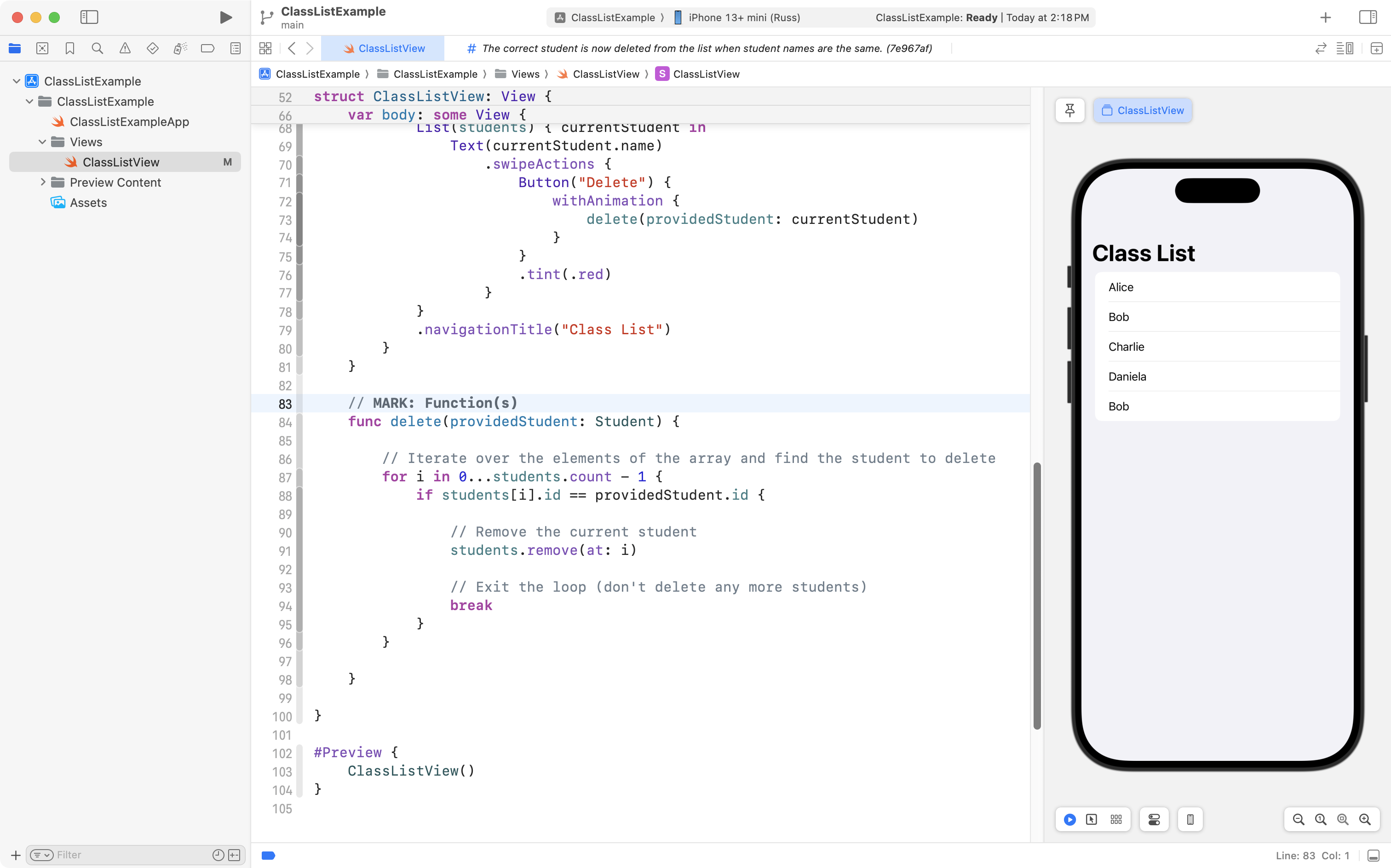 As you can see, the project is now well organized, and, the correct student is still deleted when the user tries to remove someone from the class! 🎉