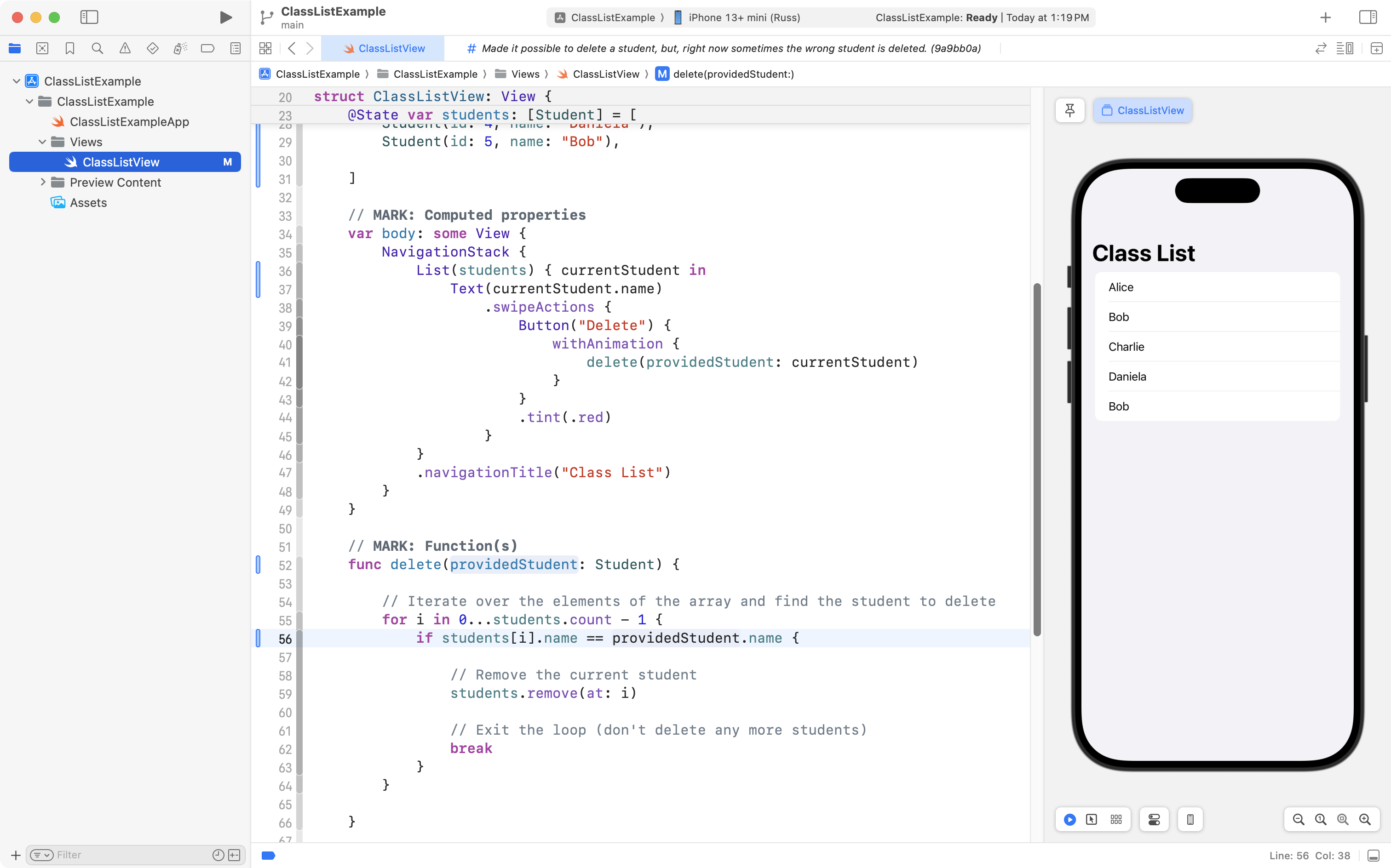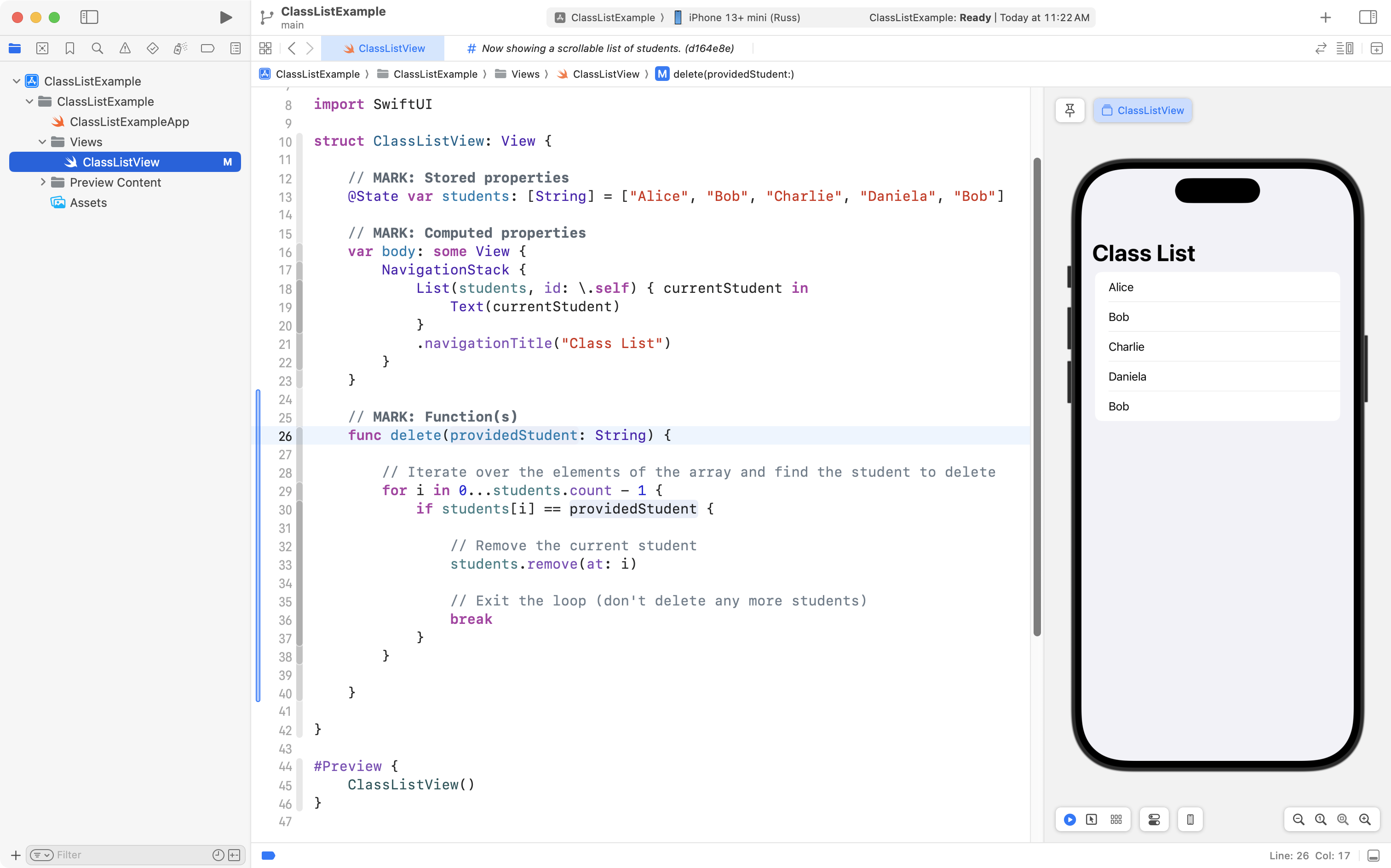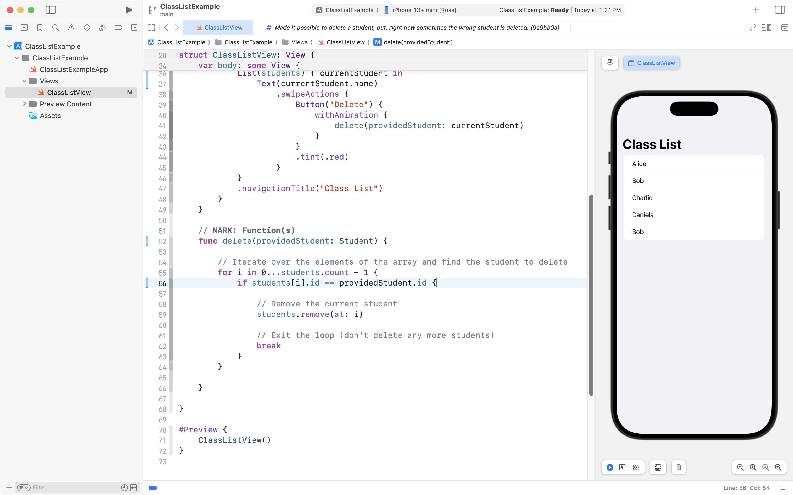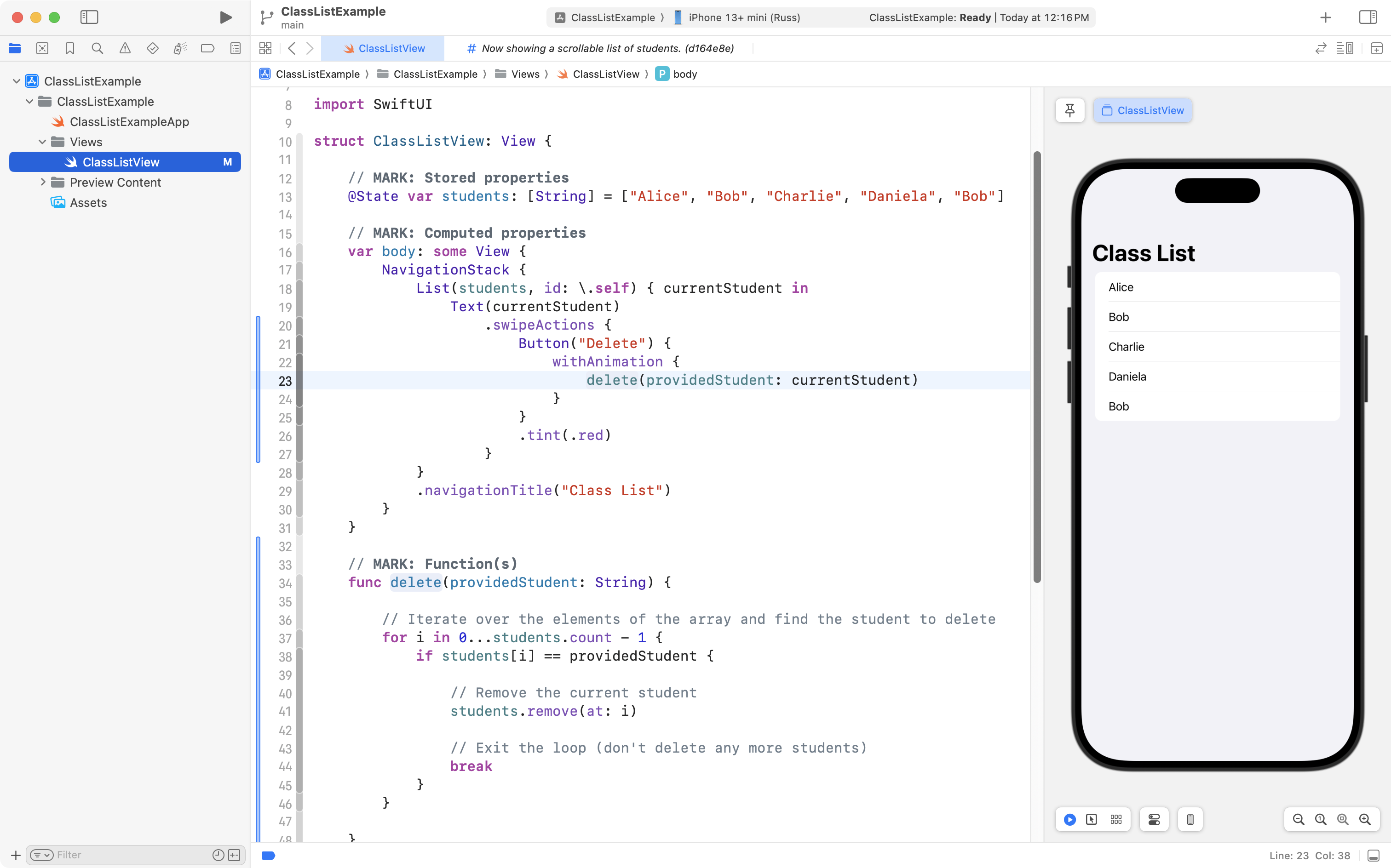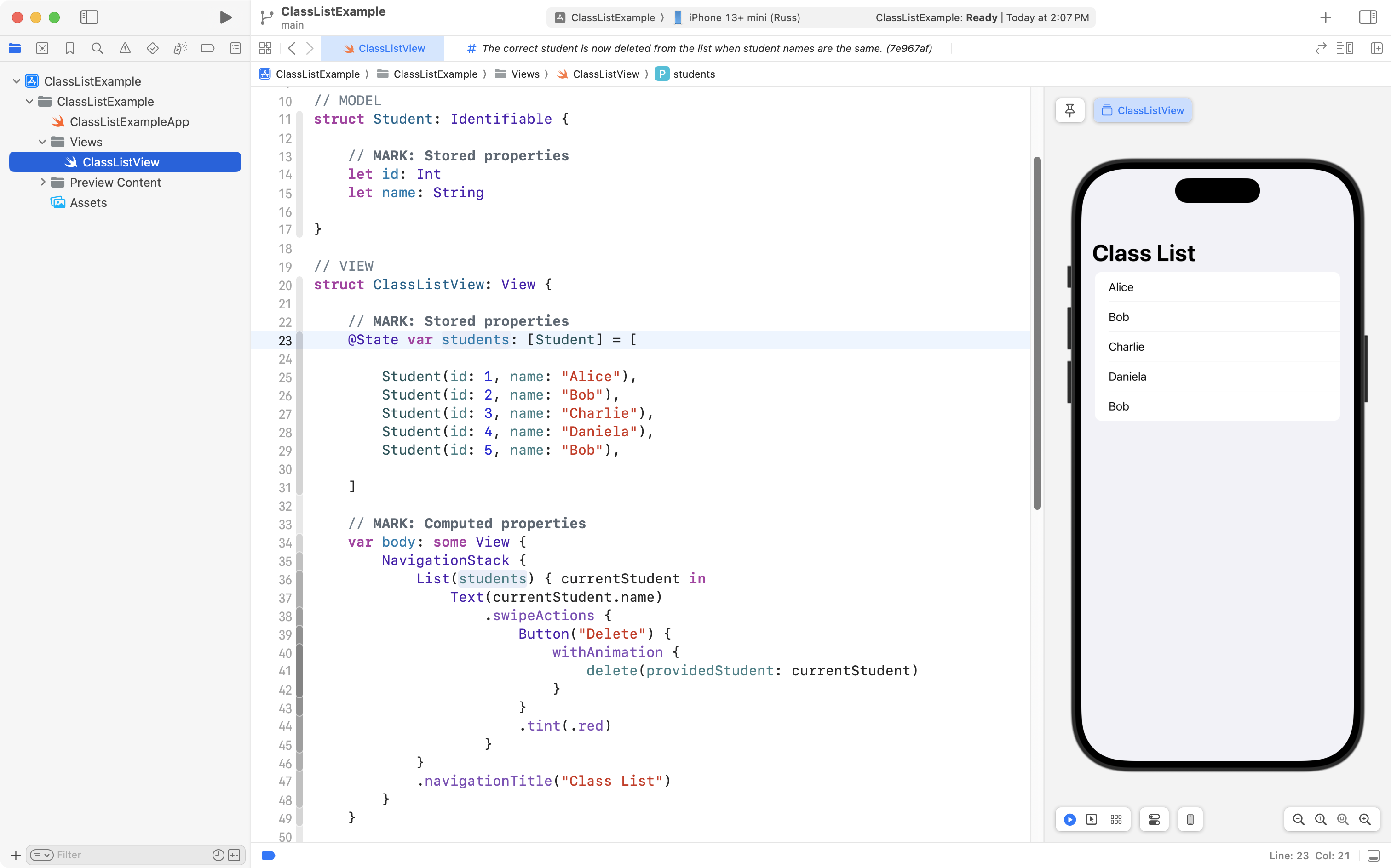 As you can see, the project is now well organized, and, the correct student is still deleted when the user tries to remove someone from the class! 🎉