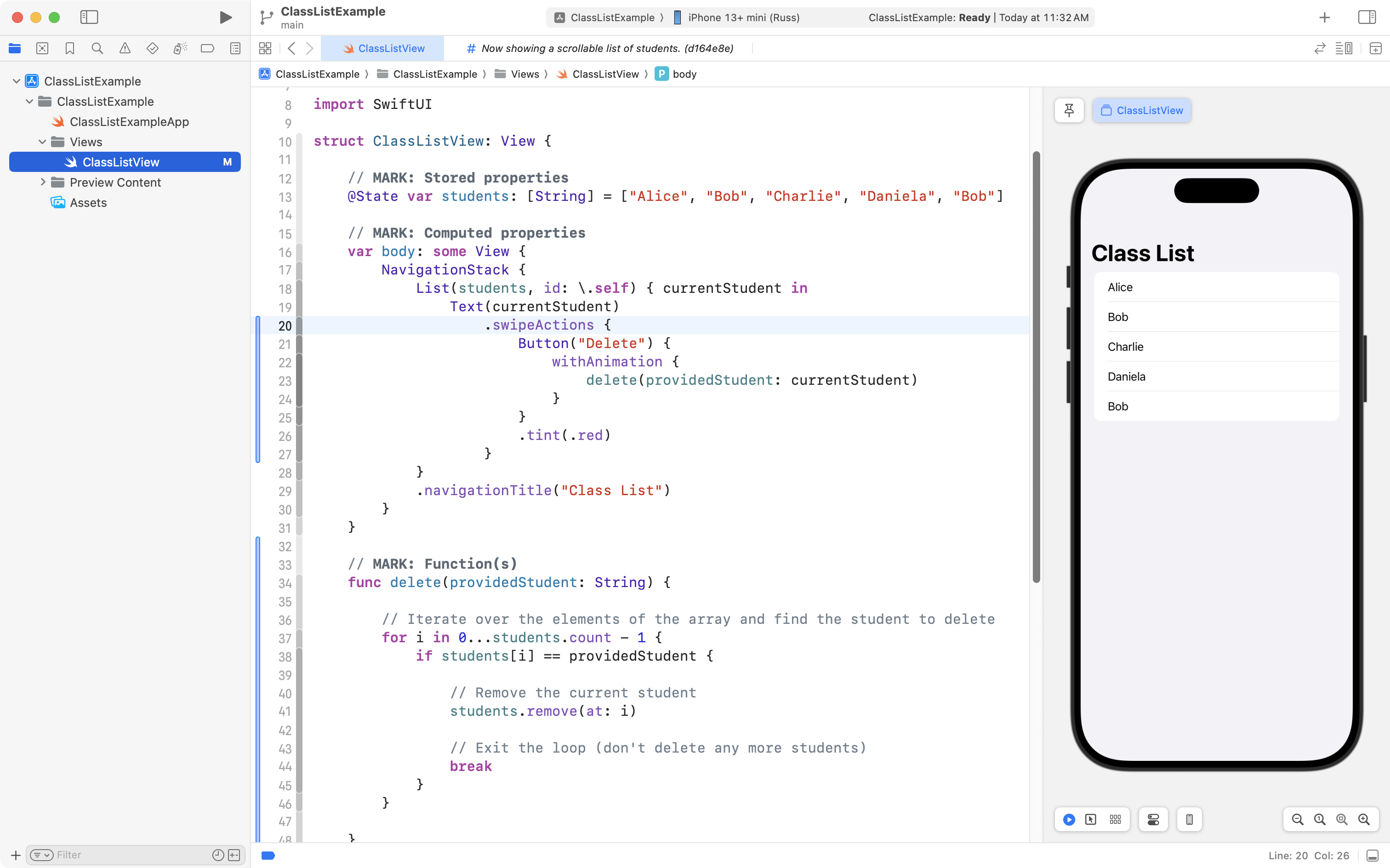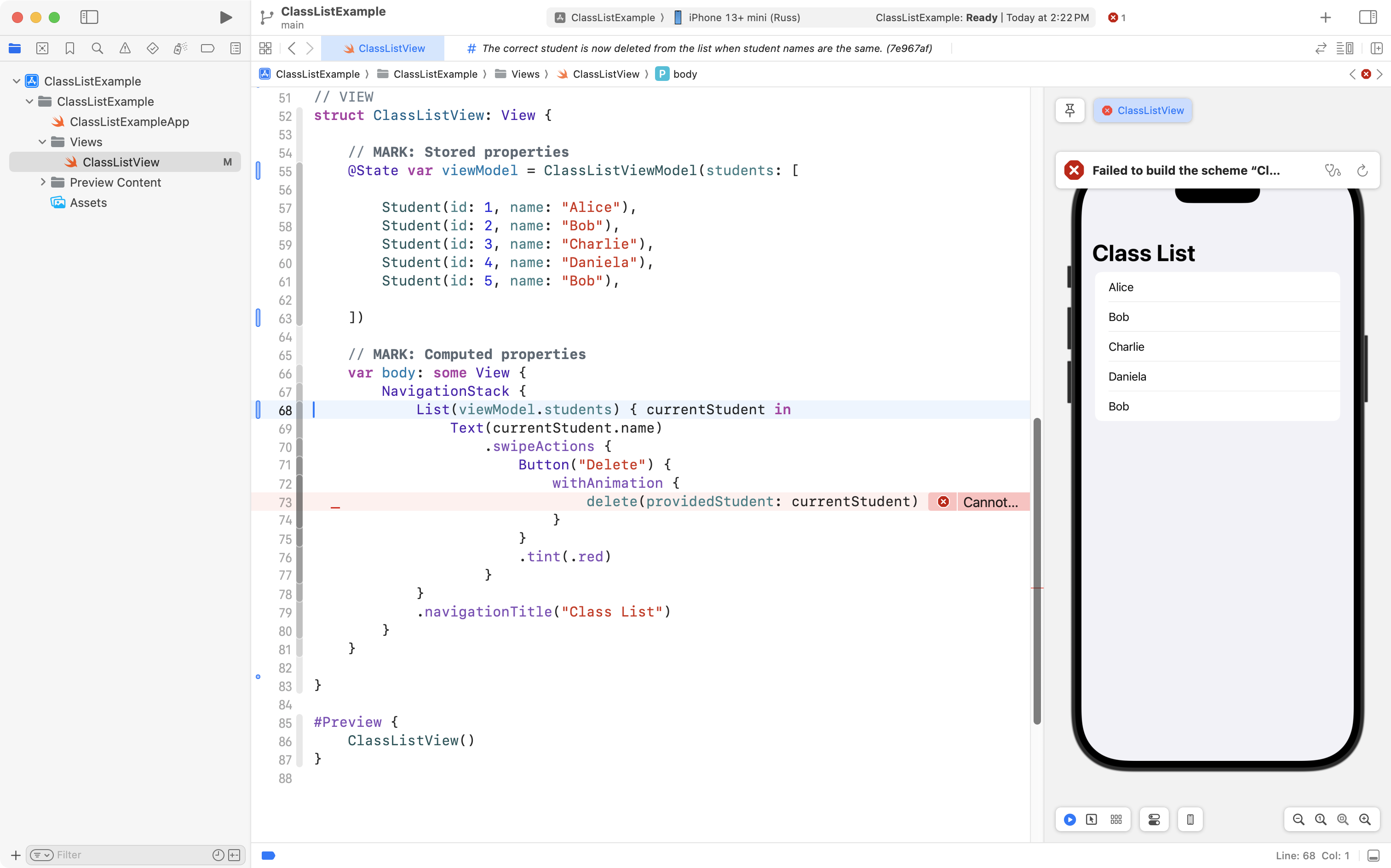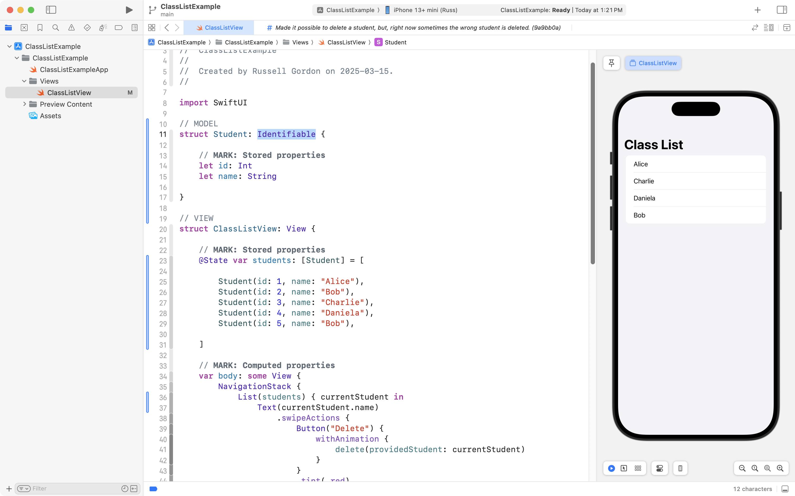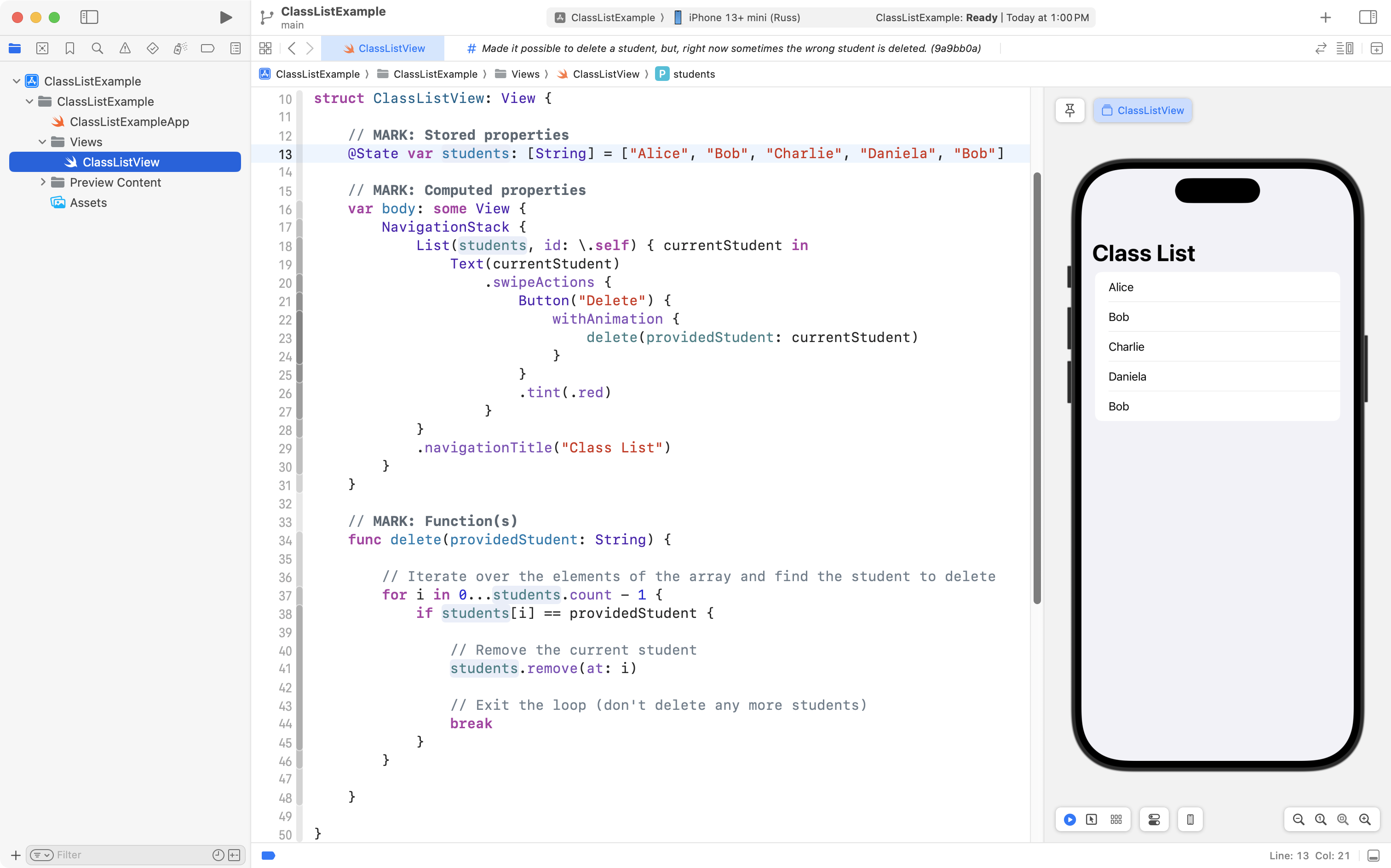 As you can see, the project is now well organized, and, the correct student is still deleted when the user tries to remove someone from the class! 🎉