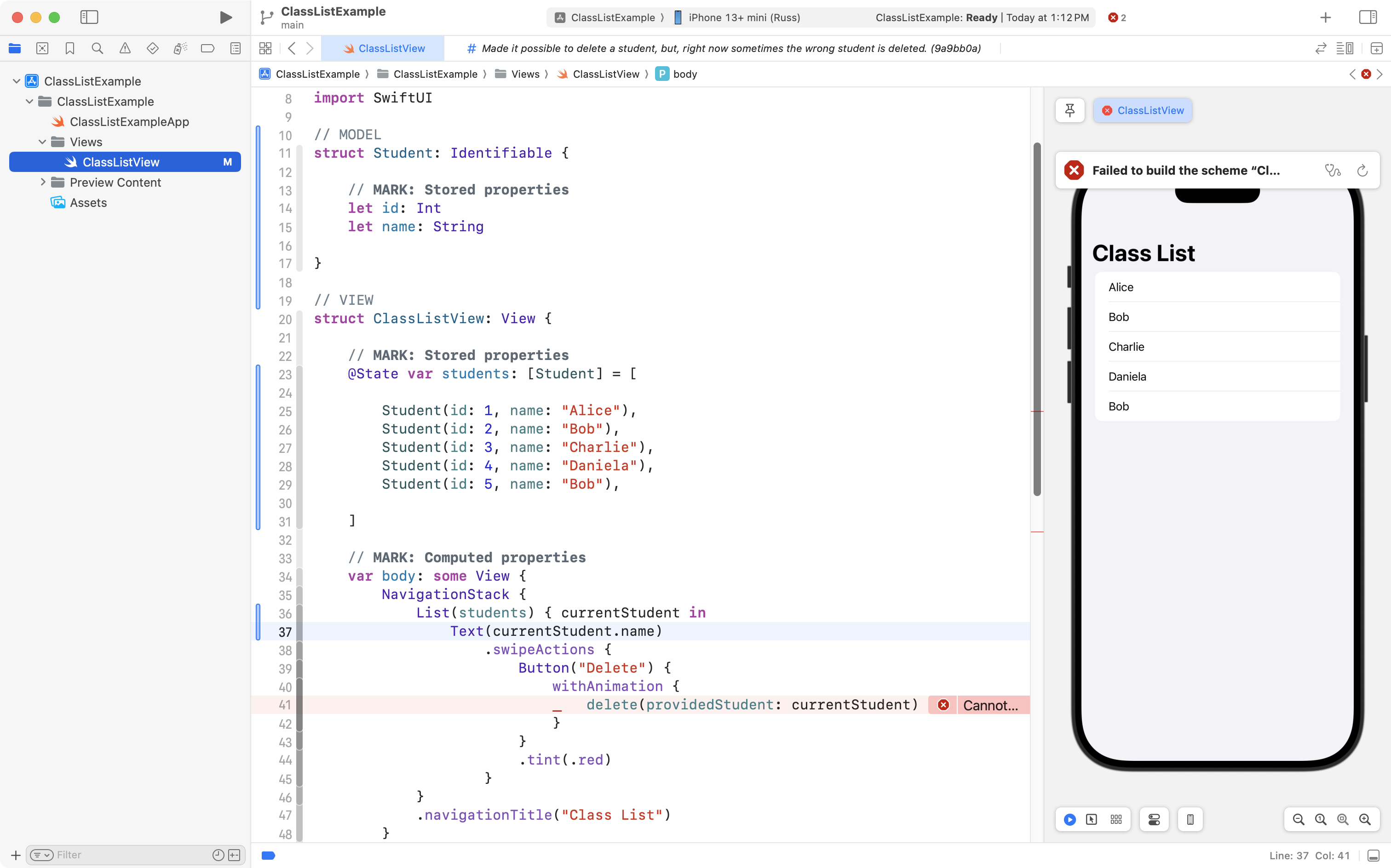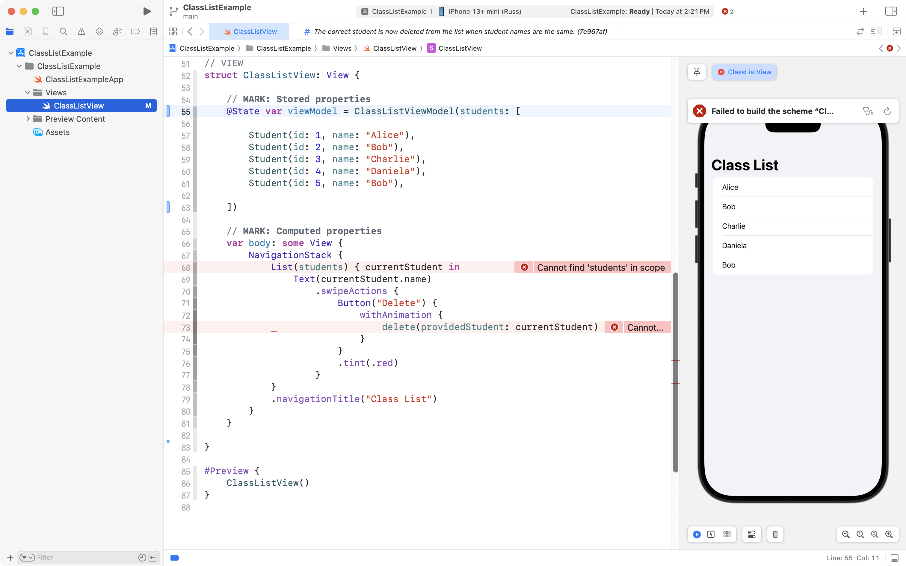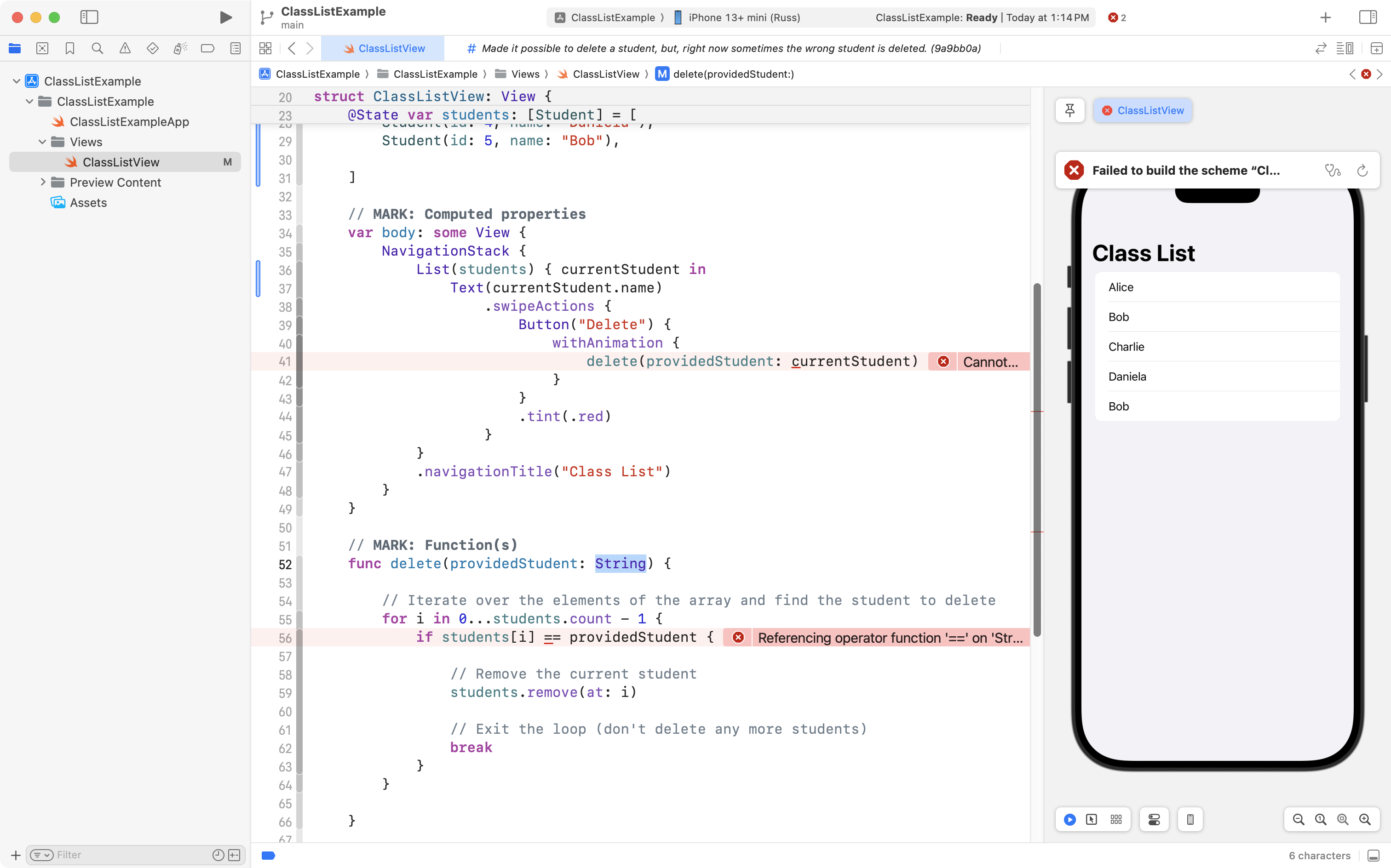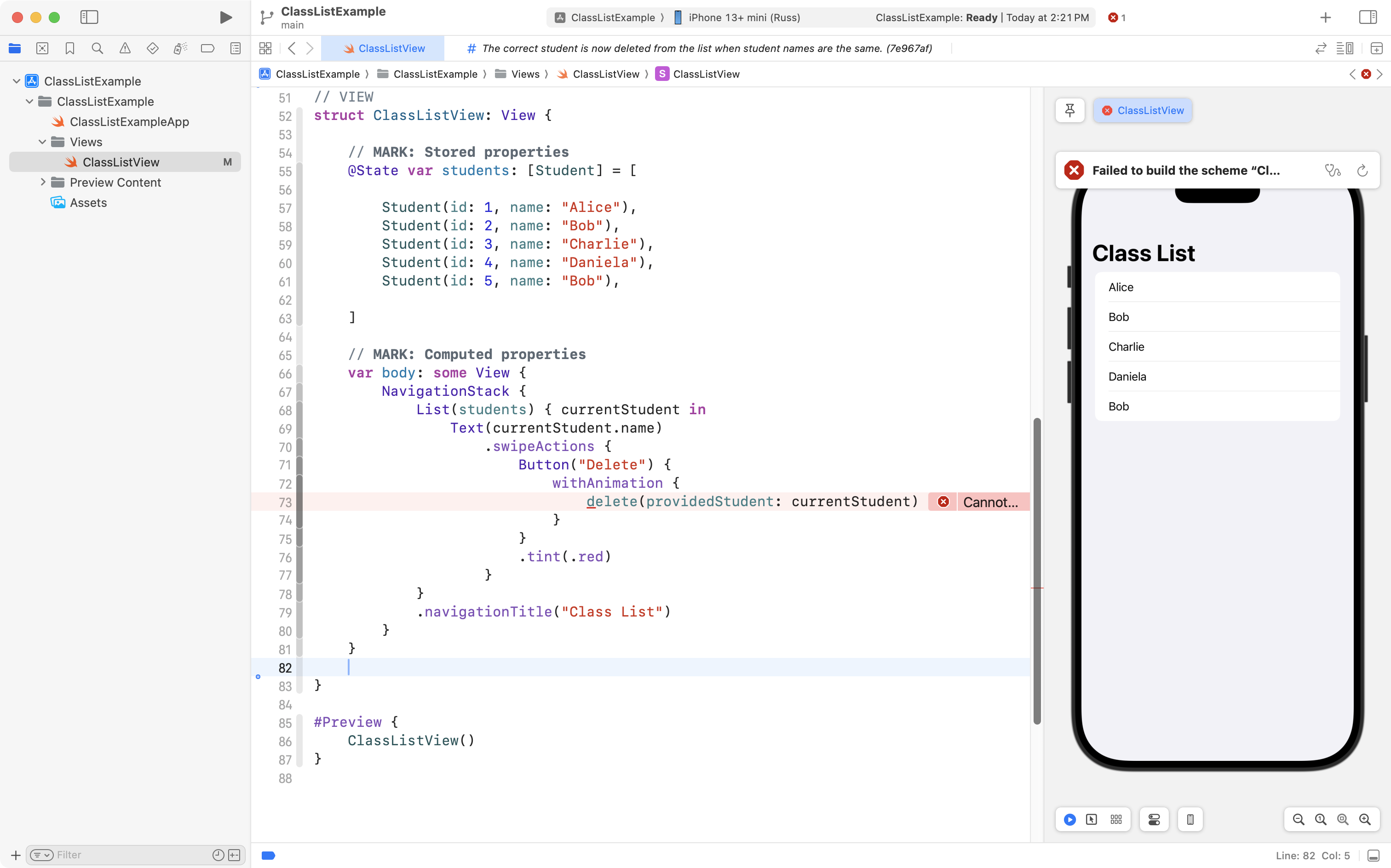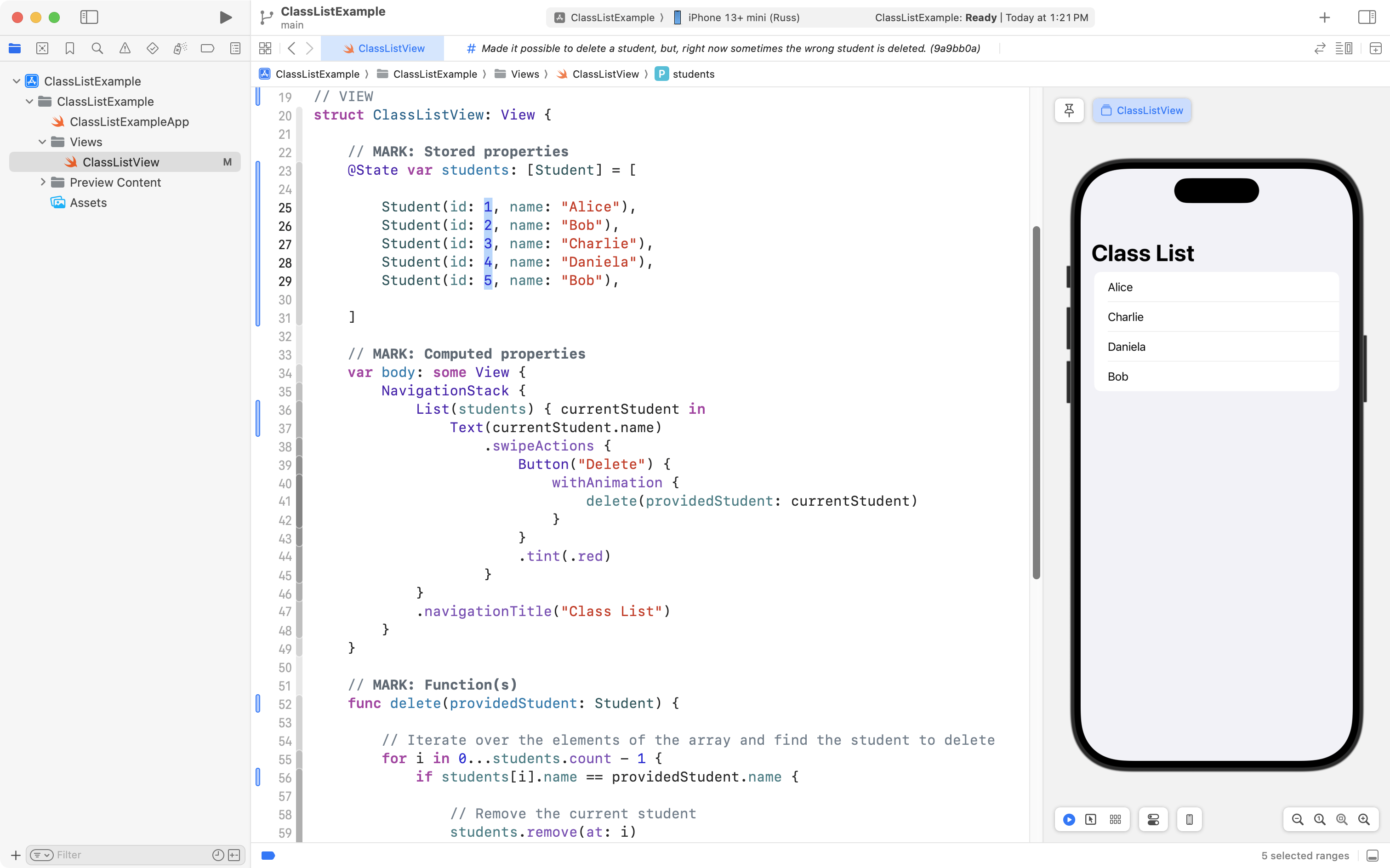 As you can see, the project is now well organized, and, the correct student is still deleted when the user tries to remove someone from the class! 🎉