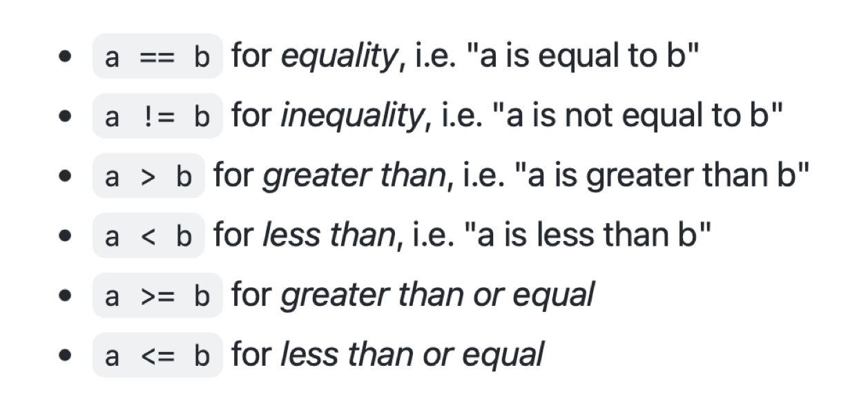A condition is often a comparison of two values. Here are all the ways two numeric values can be compared: