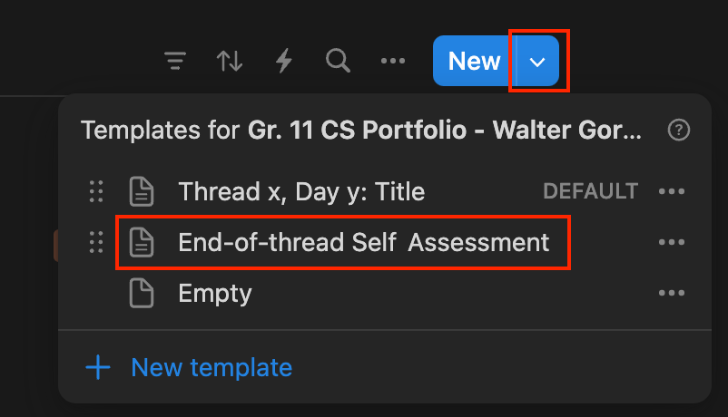 Go to Notion, click the small arrow at right beside the blue New button, then select the End-of-thread Self Assessment option.