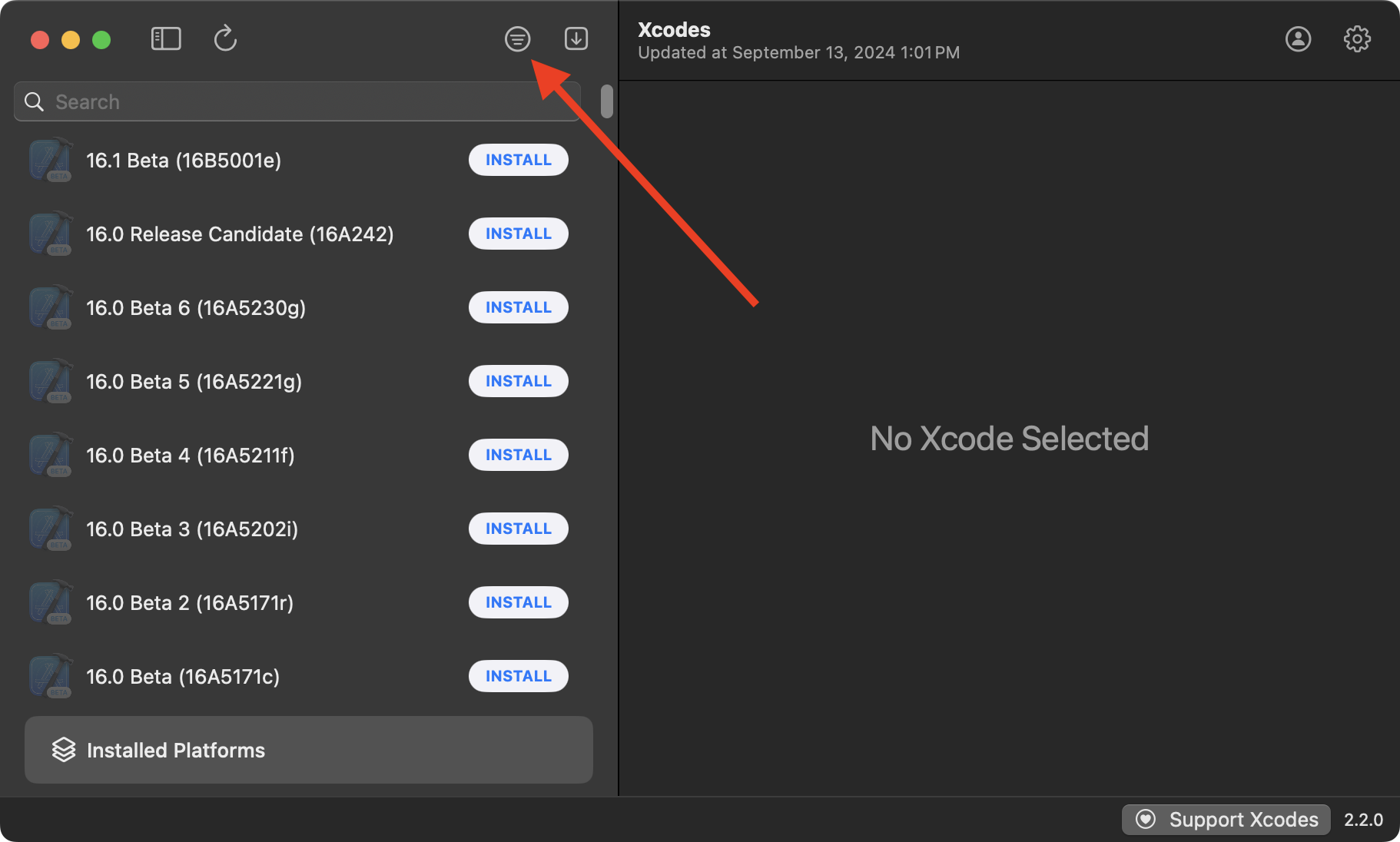 By default Xcodes shows all versions of Xcode – versions that are official releases, as well as beta versions: