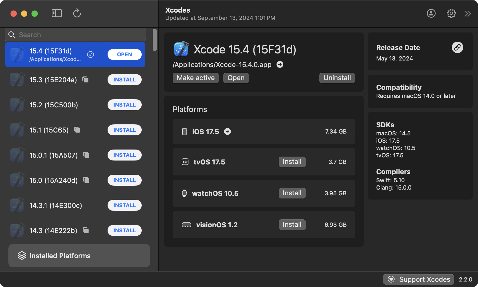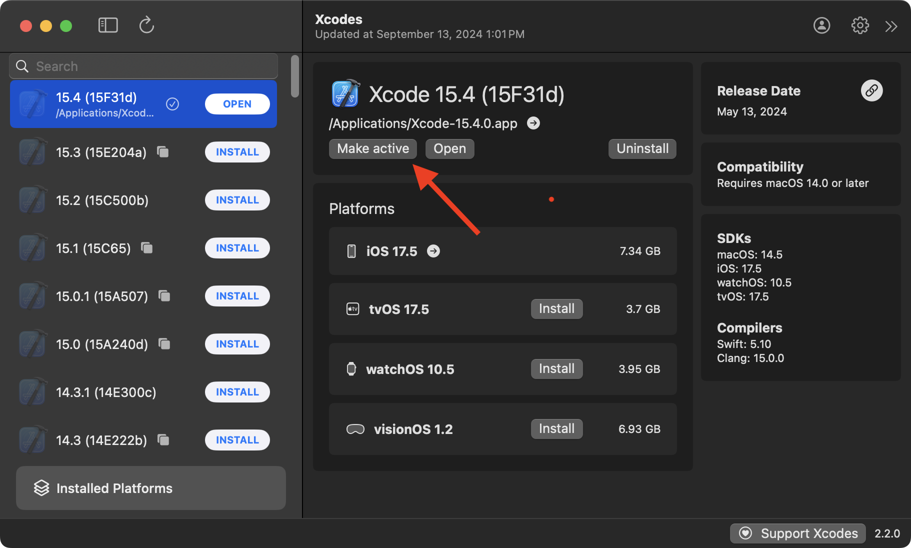 After pressing the Make active button, you will see a green checkmark beside Xcode 15.4:
