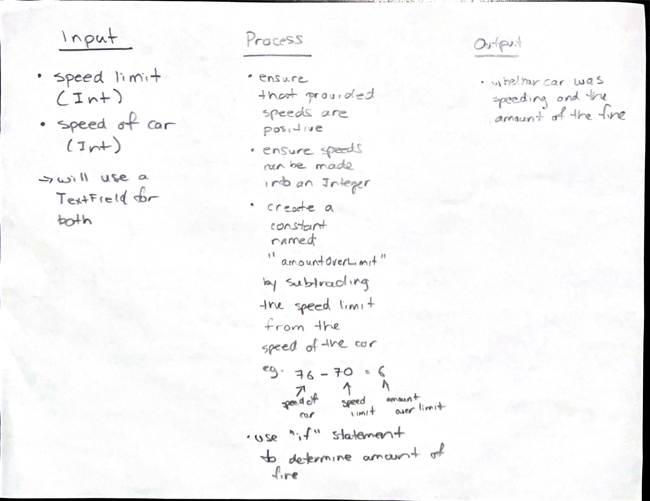 Output is whether the car was speeding or not, and if so, the amount of the fine, according to this chart: