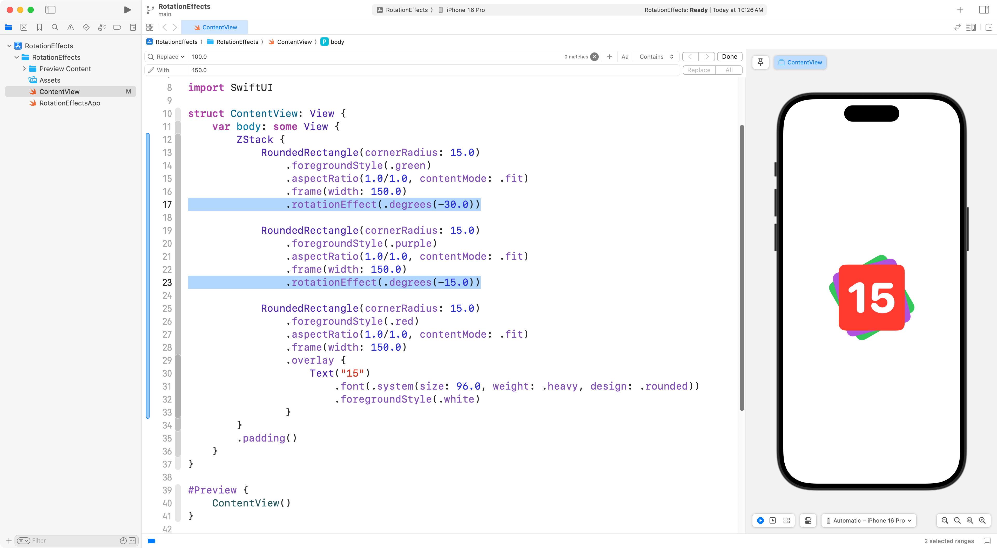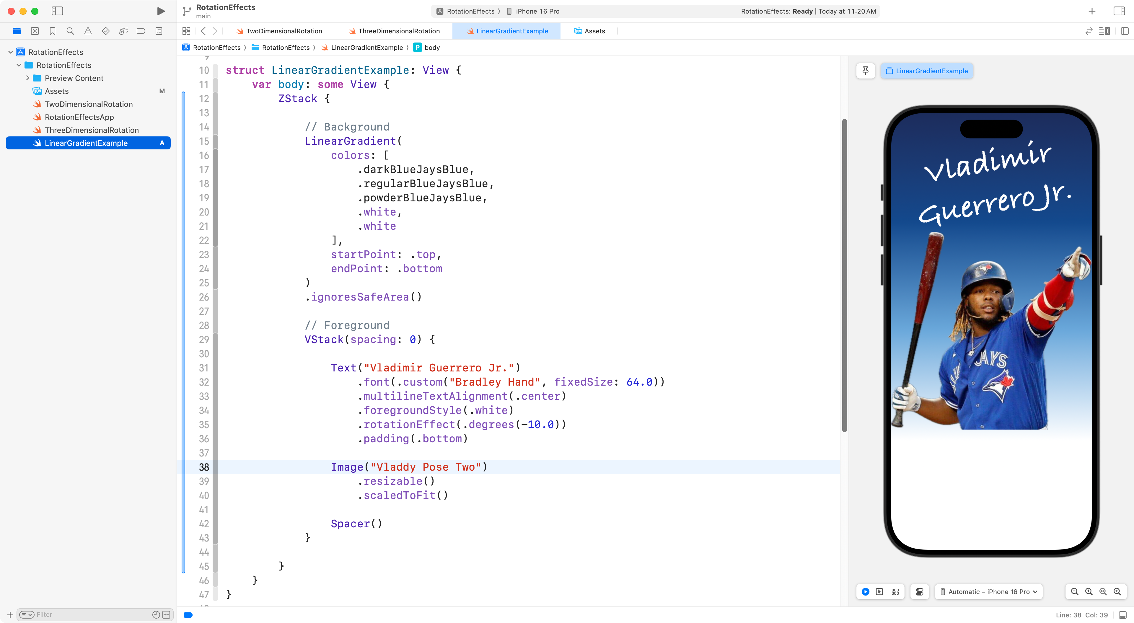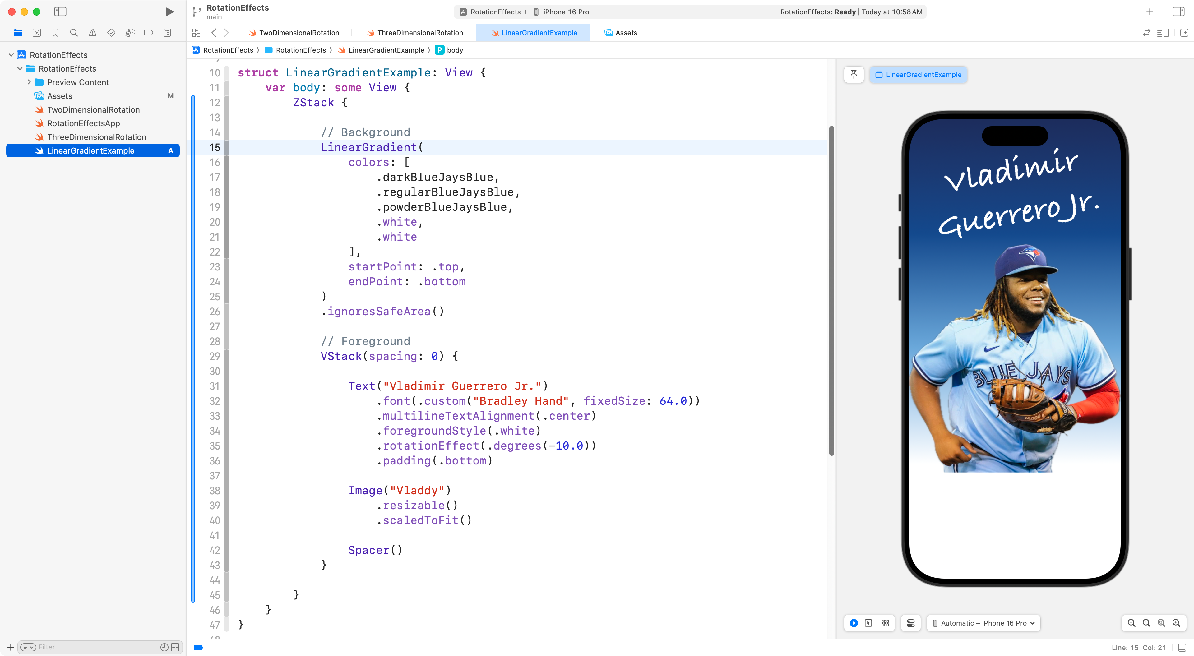 Read more about rotating views in two dimensions on page 901 of SwiftUI Views Mastery.