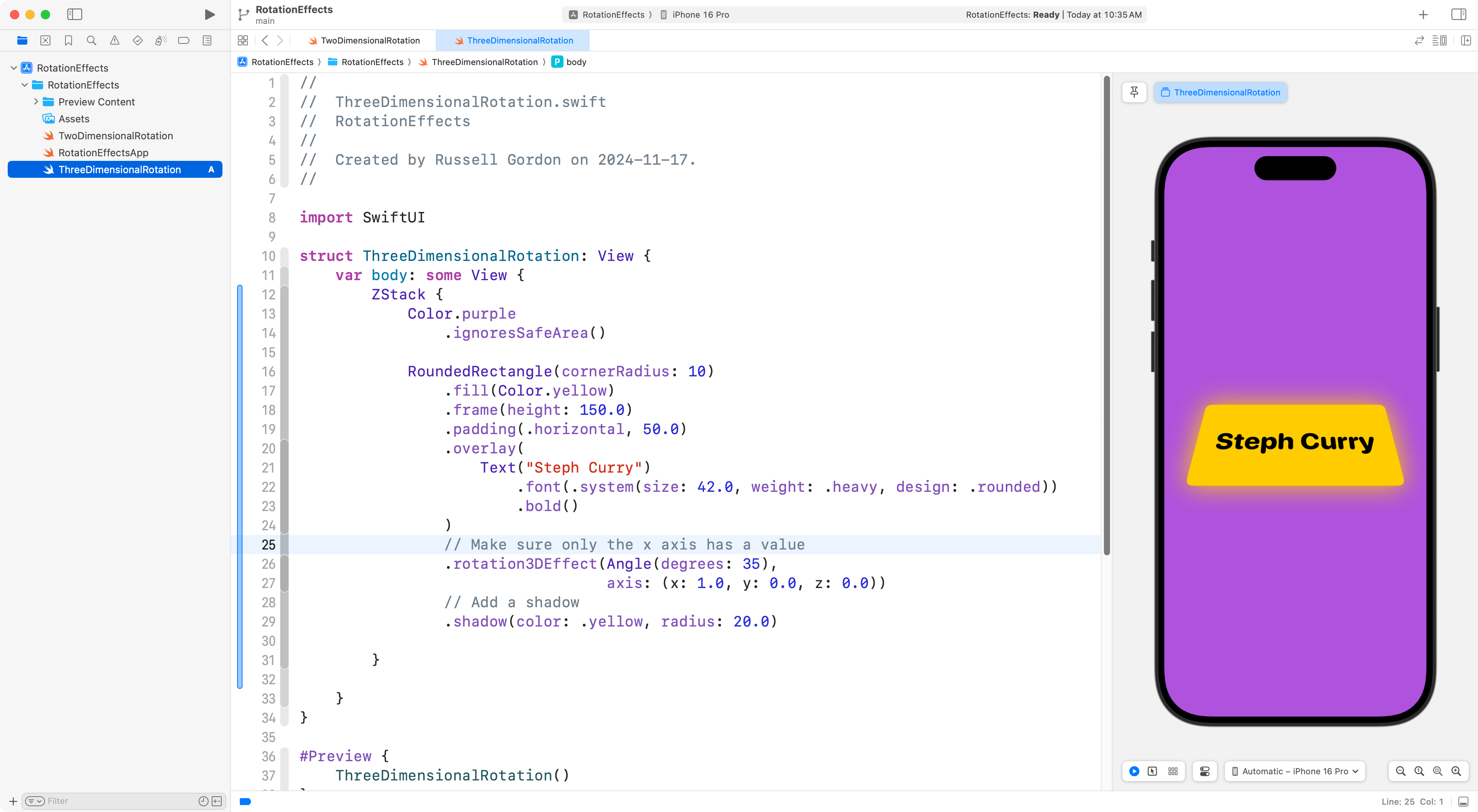 Read more about rotating views in three dimensions on page 904 of SwiftUI Views Mastery.