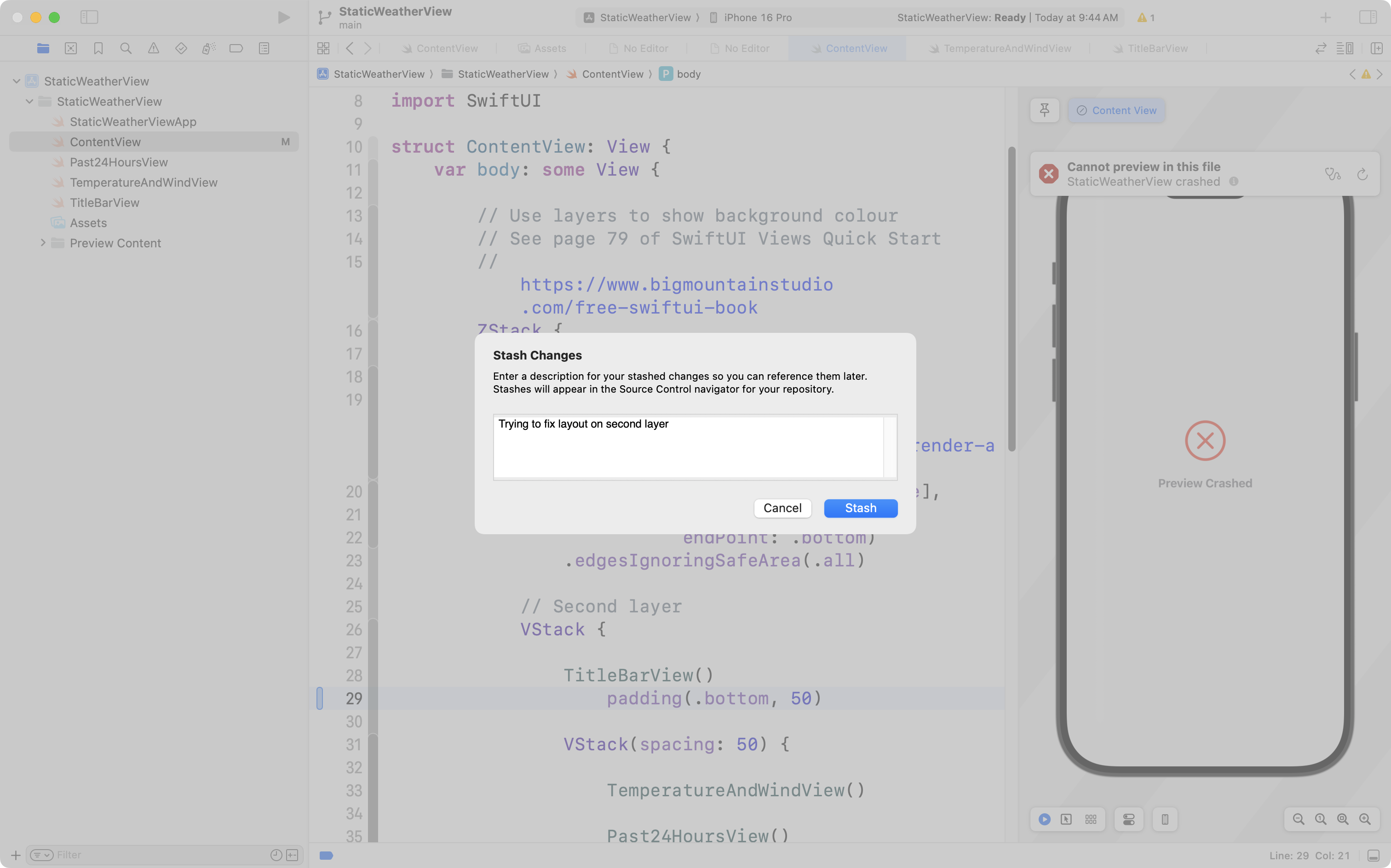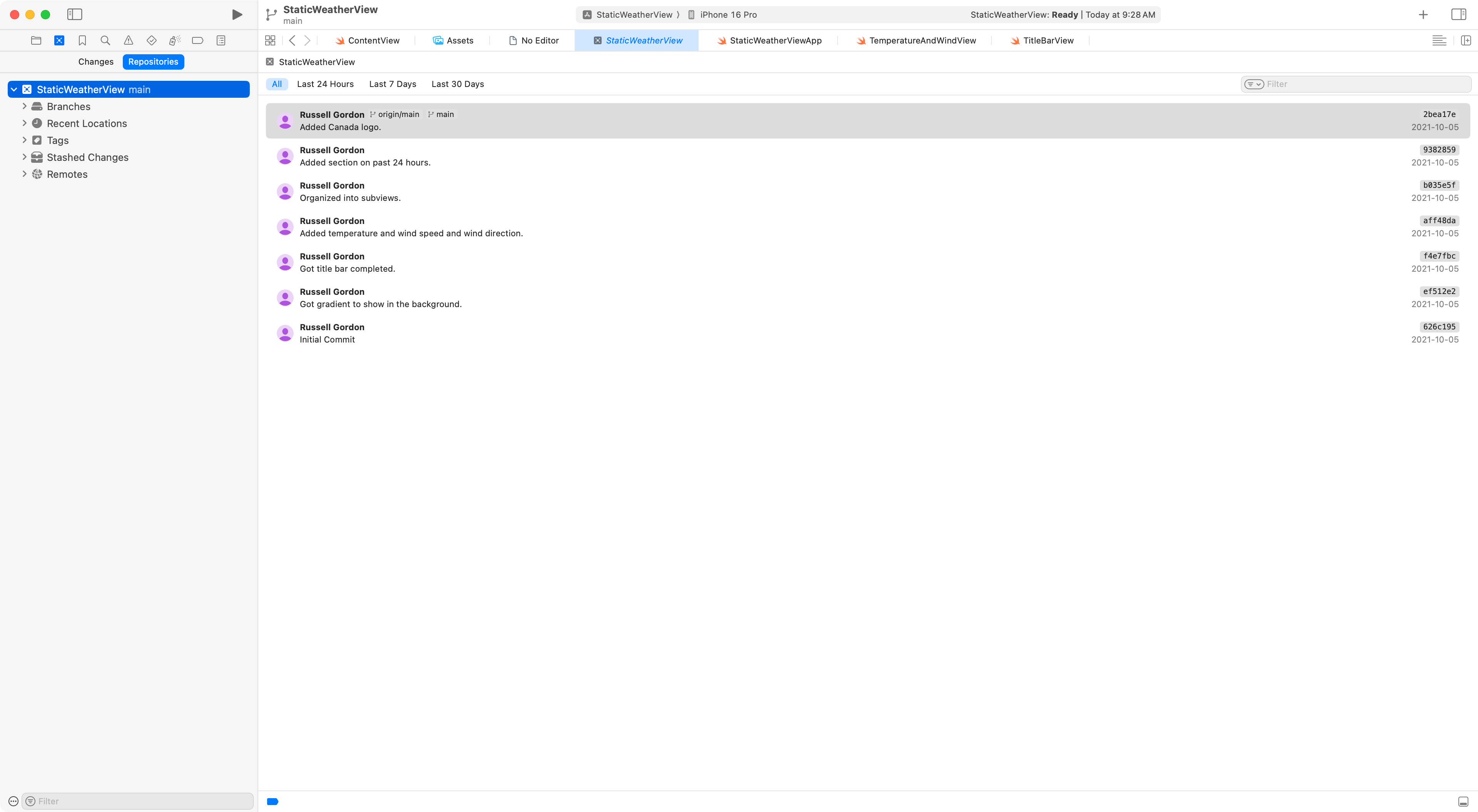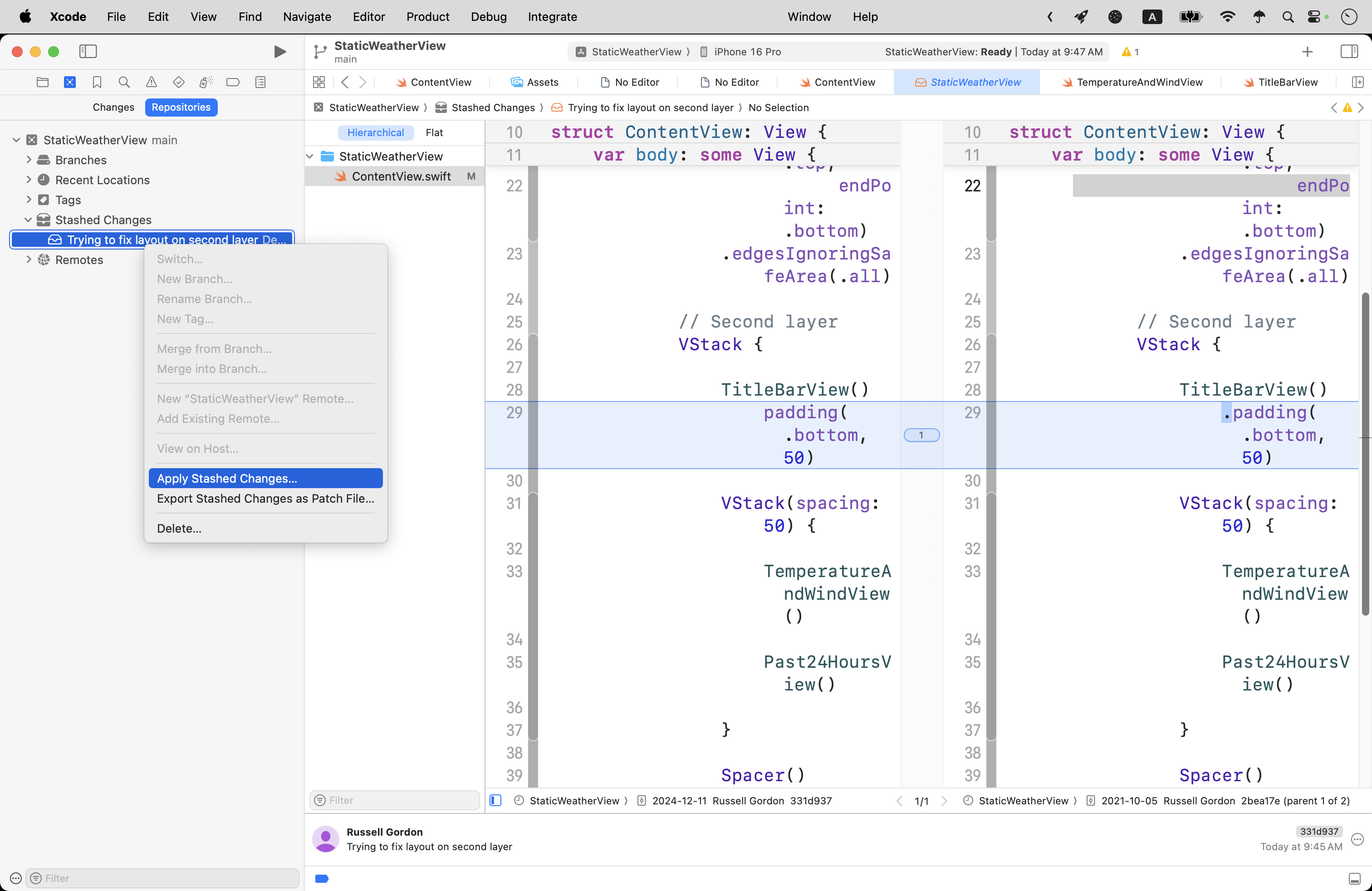 For example, we can see here in this project that we’ve changed just one file – the M means ContentView has been modified since the last commit: