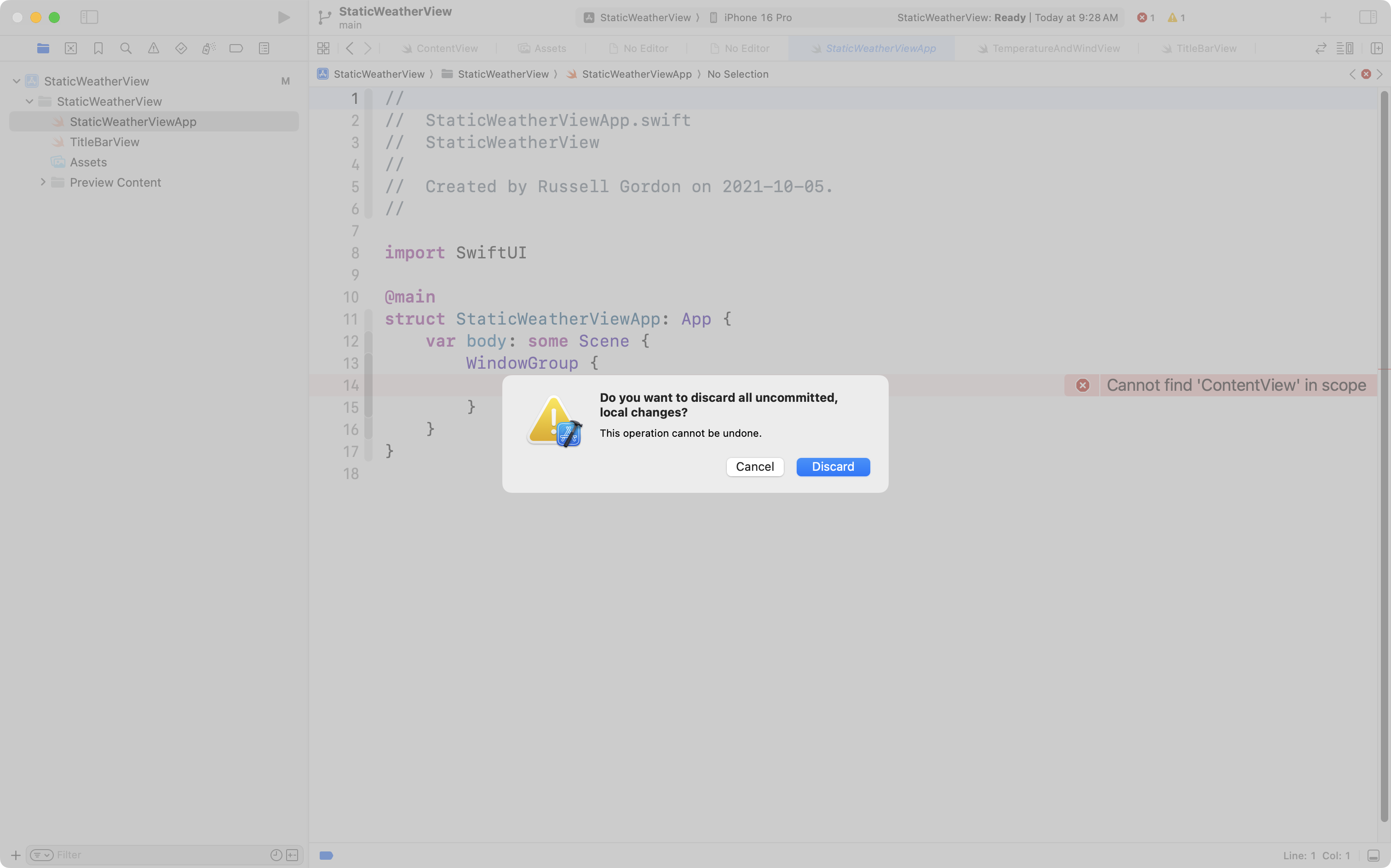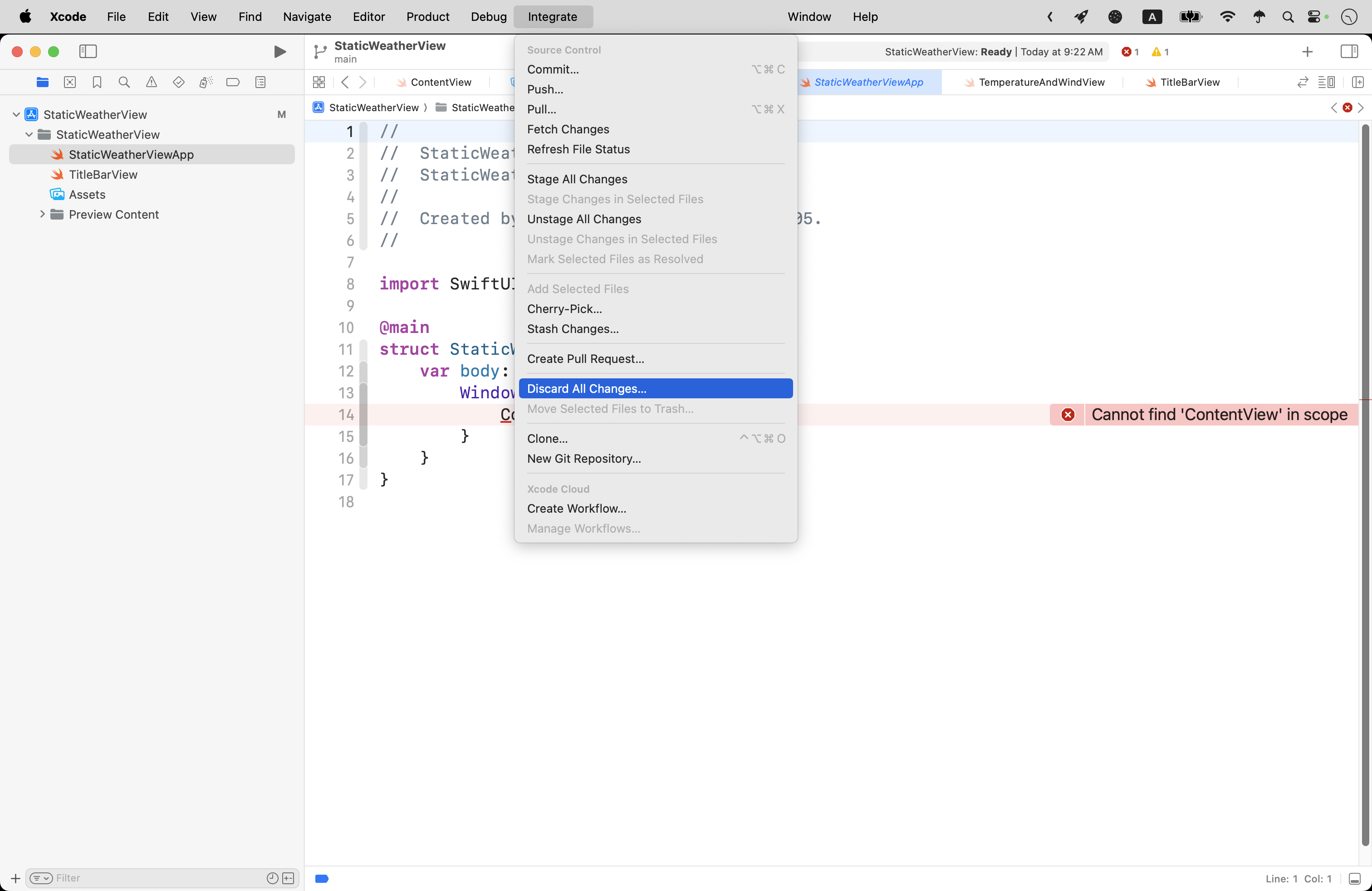 We can revert our project back to the state it was in at the point of our most recent commit by choosing, from the menus in Xcode, Integrate > Discard All Changes…: