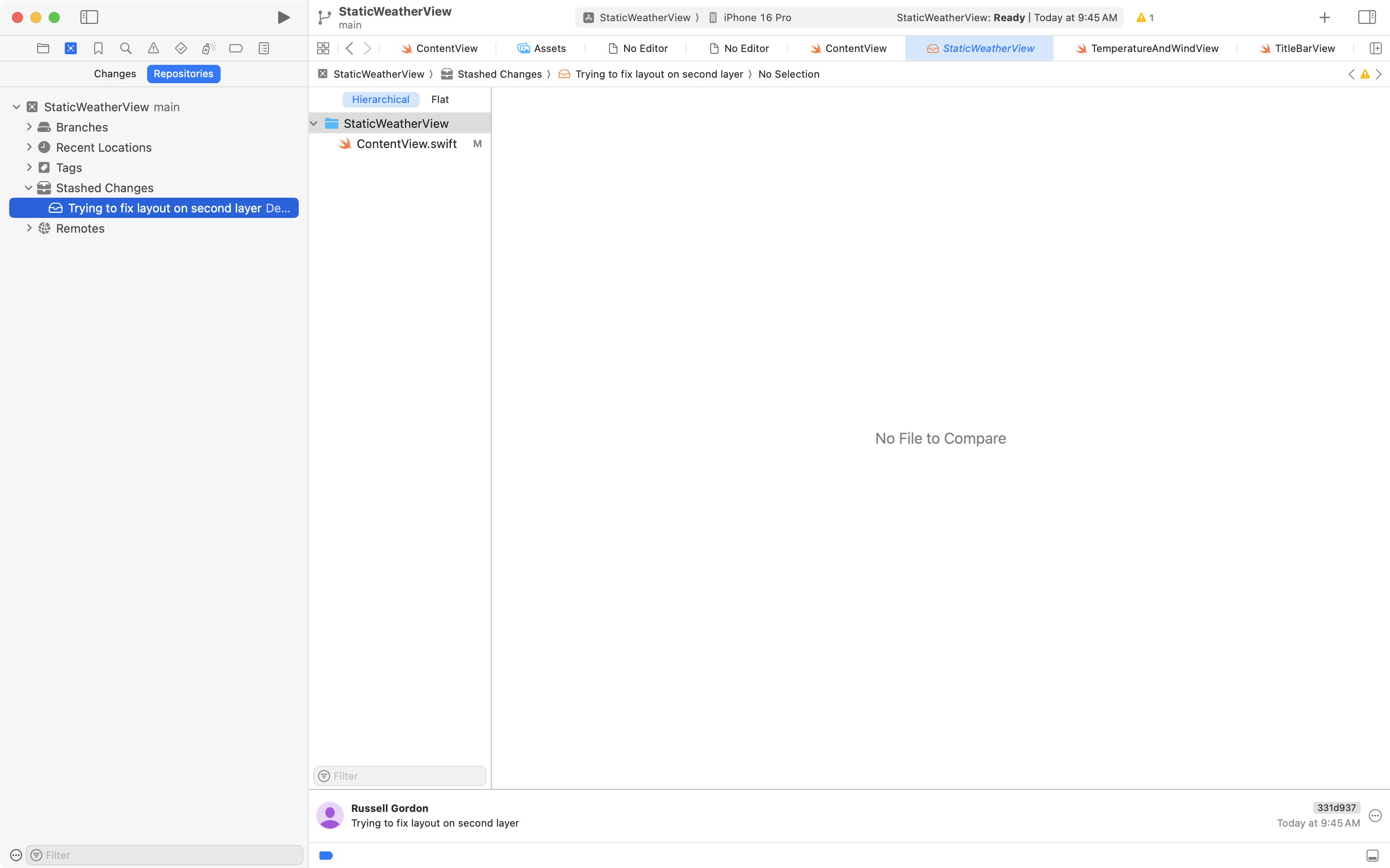 Then, back in the project navigator, any code that was in the stash is restored:
