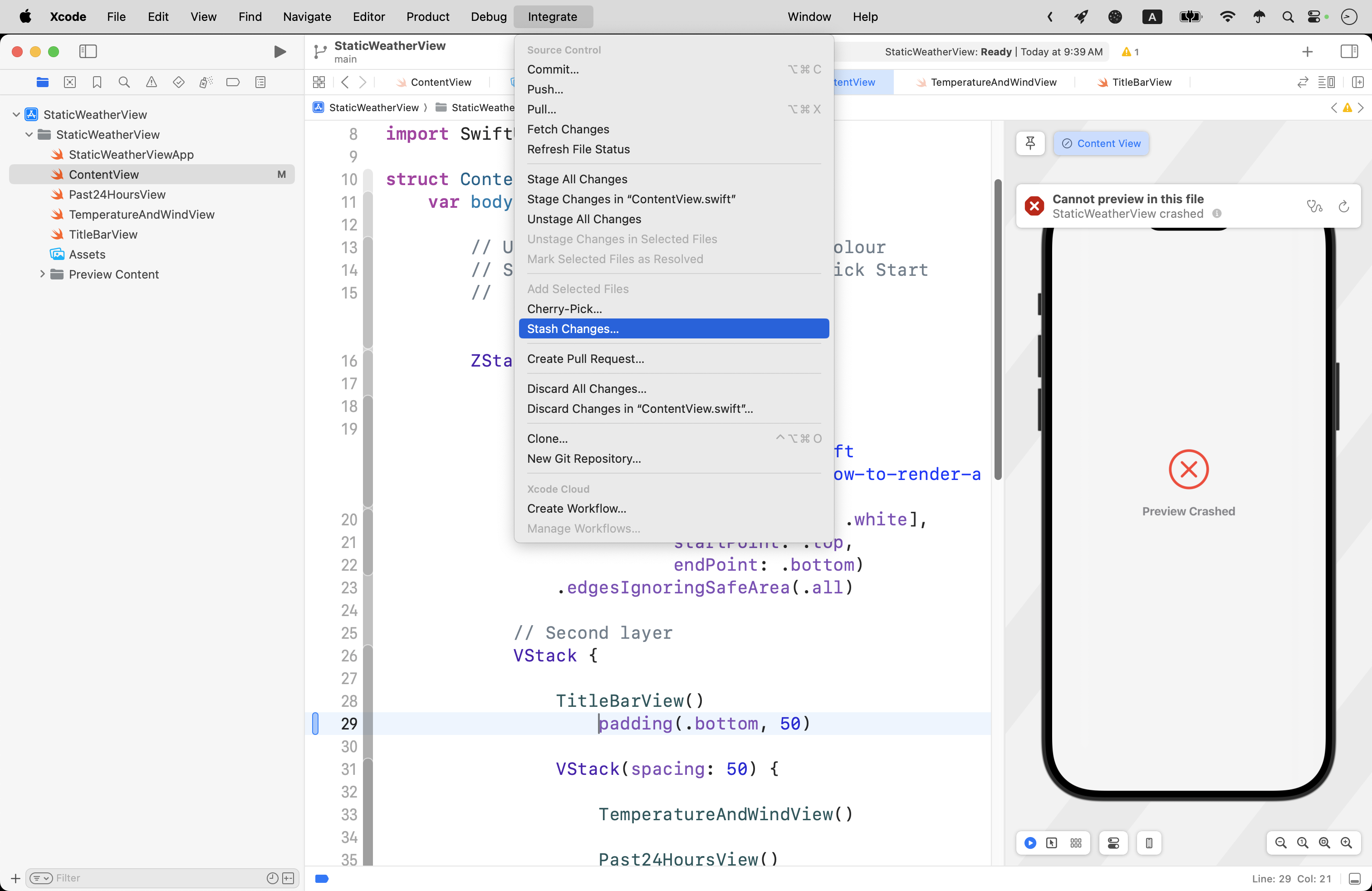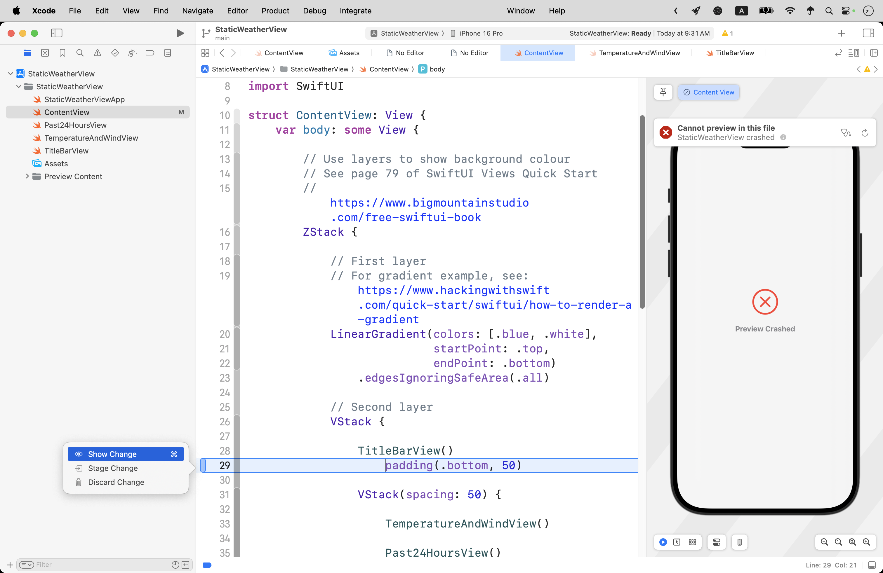 Let’s say from the example above that we still could not find the syntax error – the missing . before the padding() view modifier.