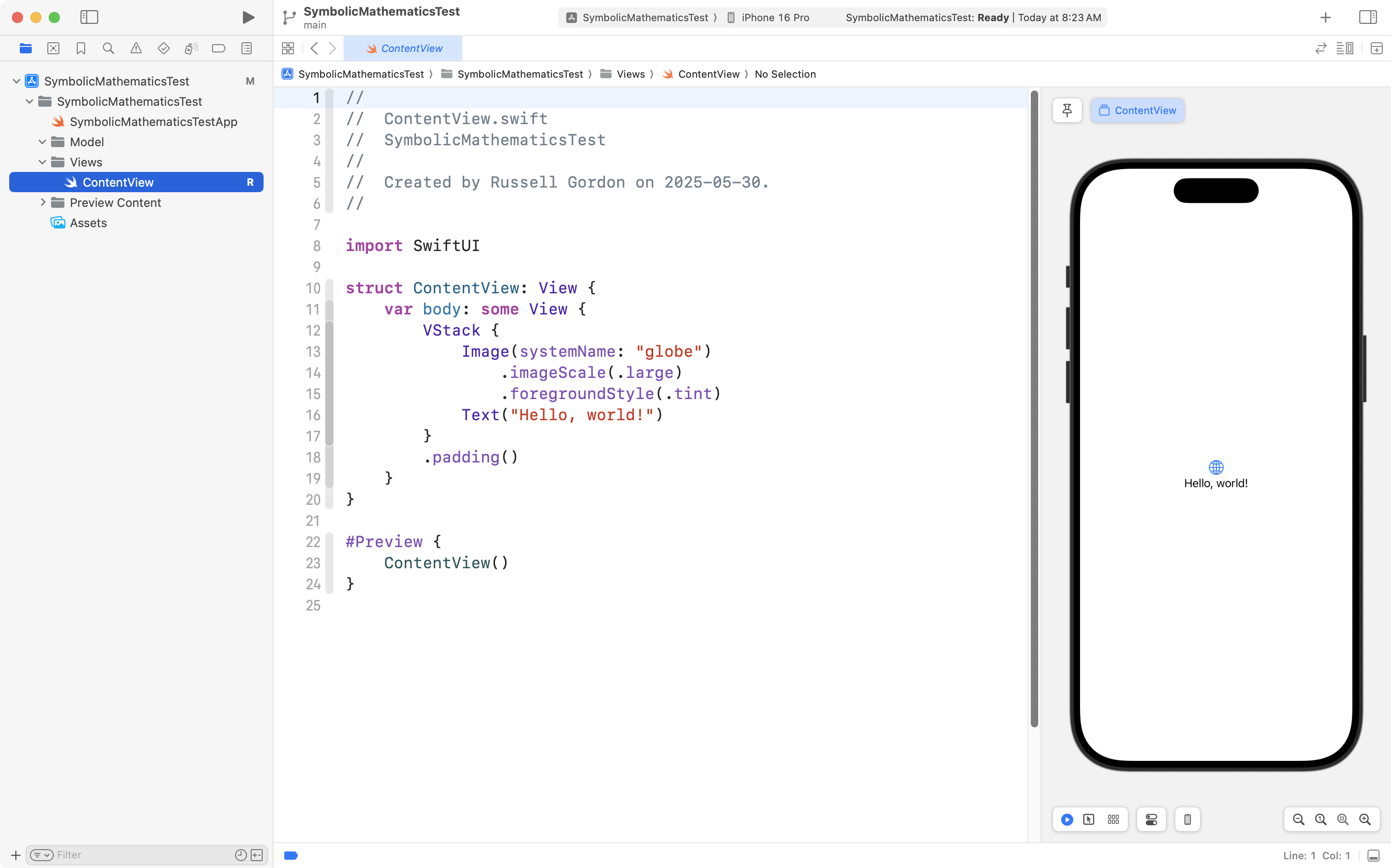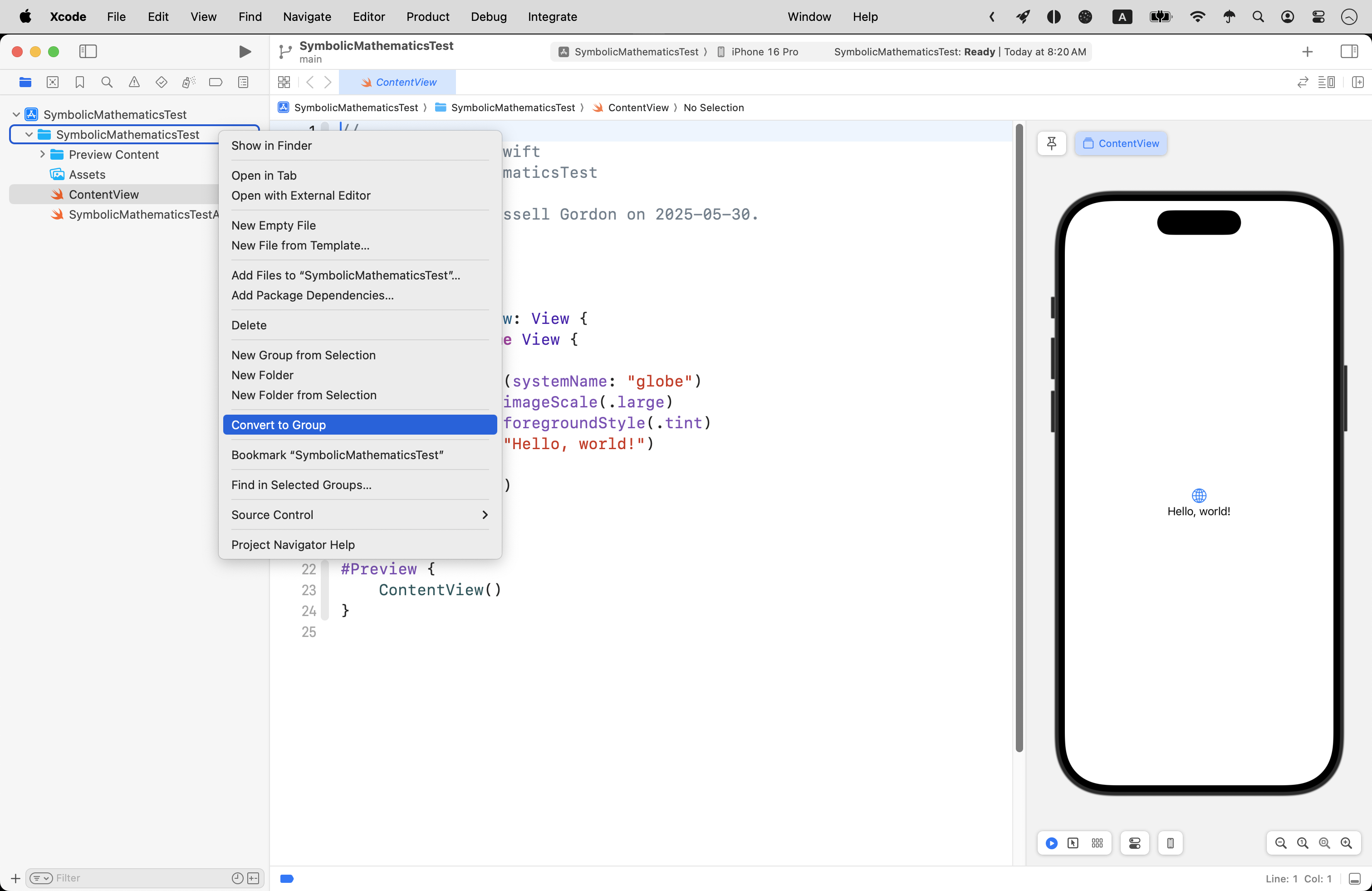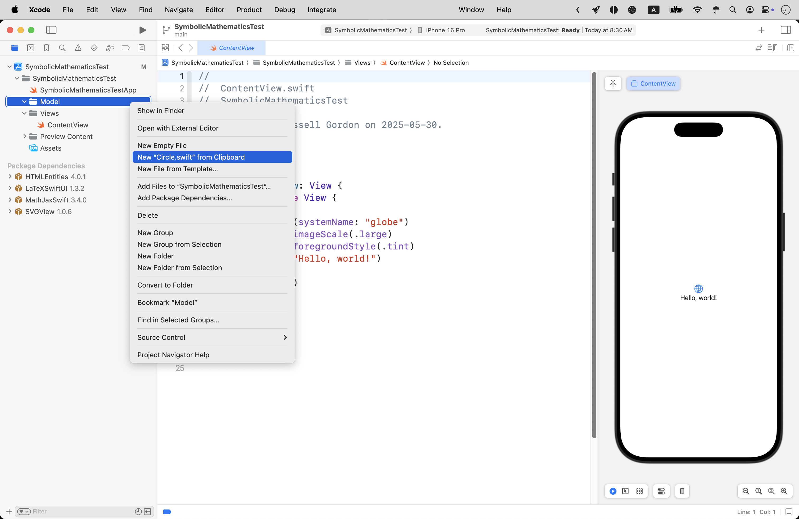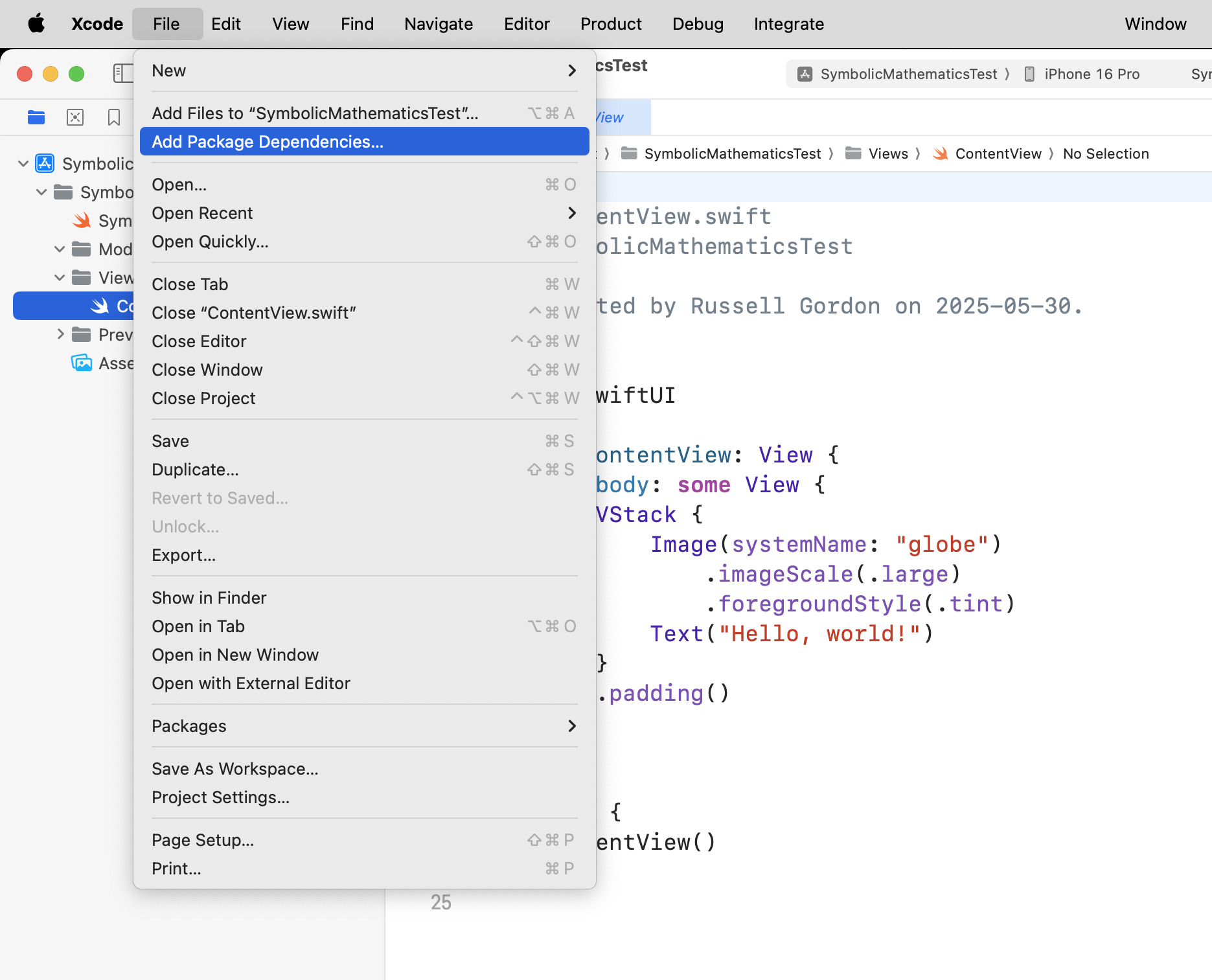 Create a new new iOS project named SymbolicMathematicsTest: