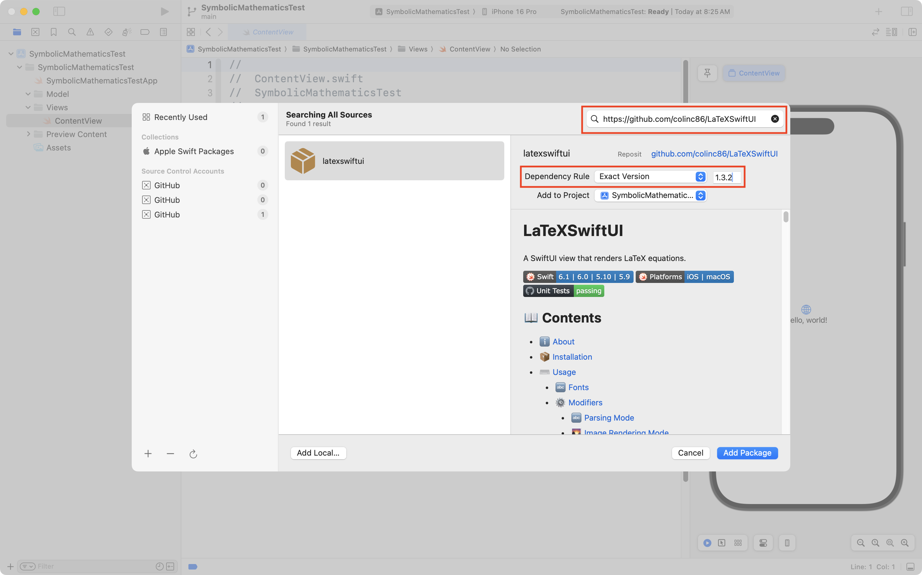 Next, we must install a specific version of the LaTeXSwiftUI package – version 1.3.2.