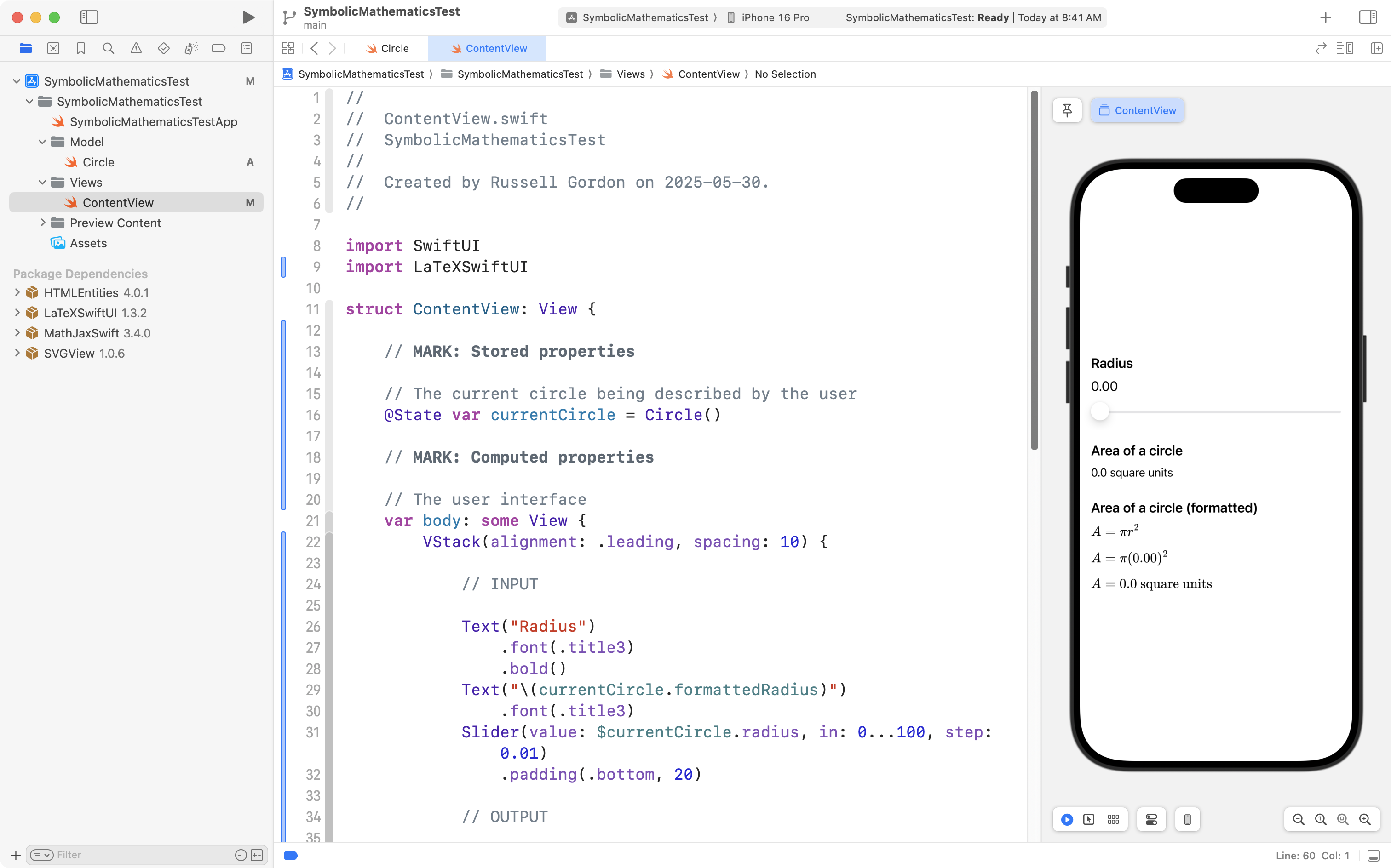 LaTeXstructure provided by the LaTeXSwiftUI package to display symbolic mathematics describing how the area of a circle is computed.