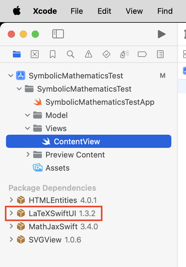 If all is well, you should see something like this in the bottom left-hand corner of your project – specifically, you should see that version 1.3.2 of LaTeXSwiftUI has been added to your project (along with some additional packages that it in turn depends upon):